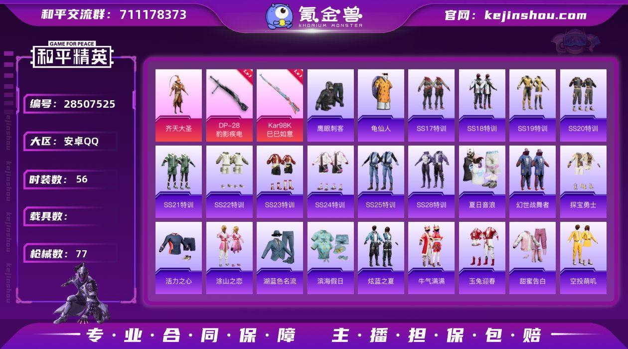 【mhp948】安卓 手Q-1粉装-2特效枪-0载具-19793热力值-1印记-56套装-77枪皮 【特效枪等级】:Kar98K-巳巳如意(一级),DP-28-豹影疾电(一级) 【优质套装】:粉装-齐天大圣 【稀有套装】:套装-龟仙人 【优质武器皮肤】:Kar98K-巳巳如意,DP-28-豹影疾电 【稀有武器皮肤】:AKM-彩虹符号,AKM-生命誓言,AKM-破晓战魂,AKM-霓虹街区,AKM-龙的传人,M16A4-幻世战舞者,M16A4-红色方程式,SCAR-L-炫彩节奏,SCAR-L-红色方程式,M416-红色方程式,M416-绯红前夜,M416-蓝色火焰,AUG-耀粉歌者,QBZ-彩虹符号,M762-瑞龙福将,Mk47-天之羽翼,Mk47-炫光之旅,Mk47-百万伏特,蜜獾-天降萌叽,UZI-红色方程式,UMP45-涂山之恋,UMP45-生命誓言,UMP45-蓝色火焰,汤姆逊-耀粉歌者,P90-巳巳如意,Kar98K-红色方程式,M24-炫彩节奏,SKS-夜灯,SKS-未来歌姬,VSS-彩虹符号,Mini14-涂山之恋,Mini14-耀粉歌者,Win94-瑞龙福将,S686-彩虹符号,S686-生命誓言,S686-红色方程式,S1897-碧影闪光,S12K-玩趣呆呆,S12K-瑞龙福将,S12K-破晓战魂,S12K-幻世战舞者,DBS-彩虹符号,M249-破晓战魂,DP-28-彩虹符号,MG3-幻世战舞者,MG3-瑞龙福将,短管霰弹-竹节火铳 【其他套装】:套装-SS17特训,套装-SS18特训,套装-SS19特训,套装-SS20特训,套装-SS21特训,套装-SS22特训,套装-SS23特训,套装-SS24特训,套装-SS25特训,套装-SS28特训,套装-夏日音浪,套装-幻世战舞者,套装-探宝勇士,套装-活力之心,套装-涂山之恋,套装-湖蓝色名流,套装-滨海假日,套装-炫蓝之夏,套装-牛气满满,套装-玉兔迎春,套装-甜蜜告白,套装-空投萌叽,套装-竞技名士,套装-粉红小猪,套装-绮丽涂鸦,套装-绯格组合,套装-耀眼新星,套装-荣耀,套装-蓝色运动,套装-虎虎生威吉莉,套装-野性战心,套装-长空猛禽,套装-骑行爱好者,套装-...