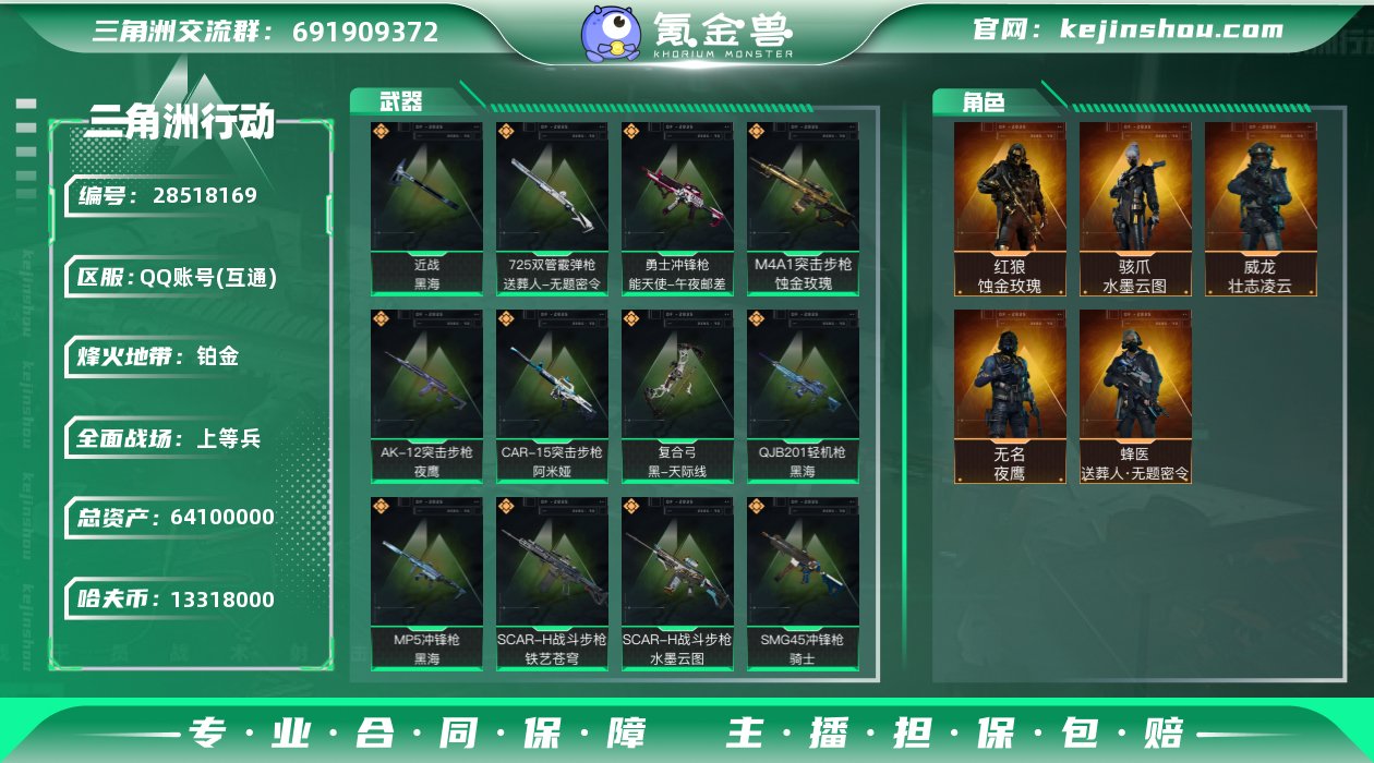 实名: 可修改 【双红皮 黑海套】总资产: 64.1M 哈夫币: 1331W 干员外观: 红狼-蚀金玫瑰,威龙-壮志凌云(S3),骇爪-水墨云图,无名-夜鹰(S4),蜂医-送葬人·无题密令(S5) 传说武器皮肤: M4A1突击步枪-蚀金玫瑰,SCAR-H战斗步枪-铁艺苍穹,SCAR-H战斗步枪-水墨云图,QJB201轻机枪-黑海,MP5冲锋枪-黑海,近战-黑海,AK-12突击步枪-夜鹰,SMG45冲锋枪-骑士,725双管霰弹枪-送葬人-无题密令,CAR-15突击步枪-阿米娅,复合弓-黑-天际线,勇士冲锋枪-能天使-午夜邮差
