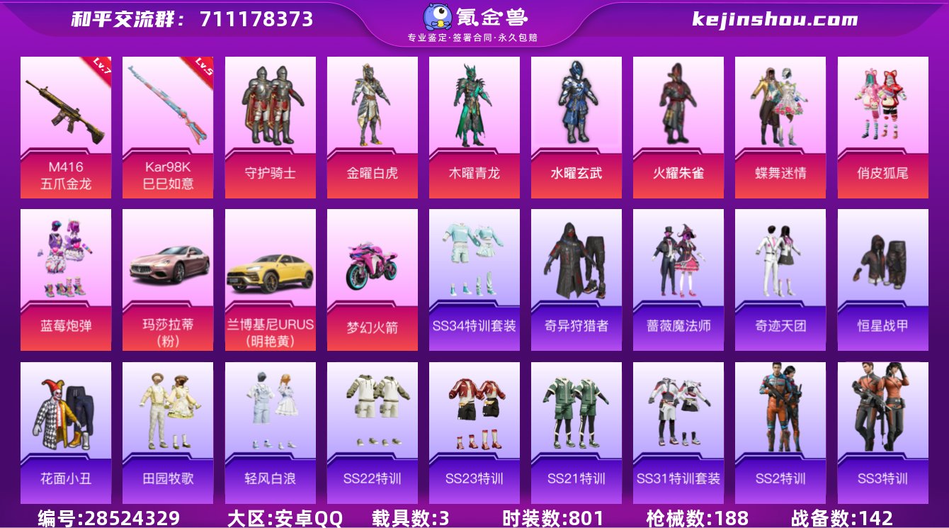 可实名安卓Q-8粉2枪3载具 满级五爪金龙粉玛莎190个套装188个枪皮肤 实名: 可修改 时装数: 801 载具数: 3 枪械数: 188 战备数: 142 热门装扮: 奇异狩猎者,蝶舞迷情,守护骑士,火曜朱雀,水曜玄武,木曜青龙,金曜白虎,花面小丑,恒星战甲,俏皮狐尾,蓝莓炮弹,奇迹天团,蔷薇魔法师 载具: 玛莎拉蒂Ghibli(粉),双人摩托-梦幻火箭,兰博基尼URUS(明艳黄) 稀有枪皮: M416五爪金龙,Kar98K-巳巳如意