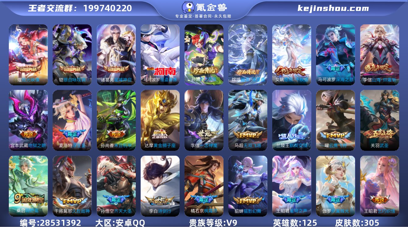 实名:不可修改 贵族等级:V9 英雄数:125 皮肤数:305 典藏皮肤数:3 无双皮肤数:0 珍品传说皮肤数:3 传说皮肤数:24 史诗皮肤数:95 拾光映像,银白咏叹调,星域神启 怪盗基德,时之奇旅-孙策,器灵·落星盏 段位:无双王者 卖家说:三典藏三珍品v9账号,和平精英连体,3粉112紫皮44级收藏家,王者号上面还有三千个星币可任意兑换一款星传说,有墨染江湖天幕,高人气热度5w+点赞1w+