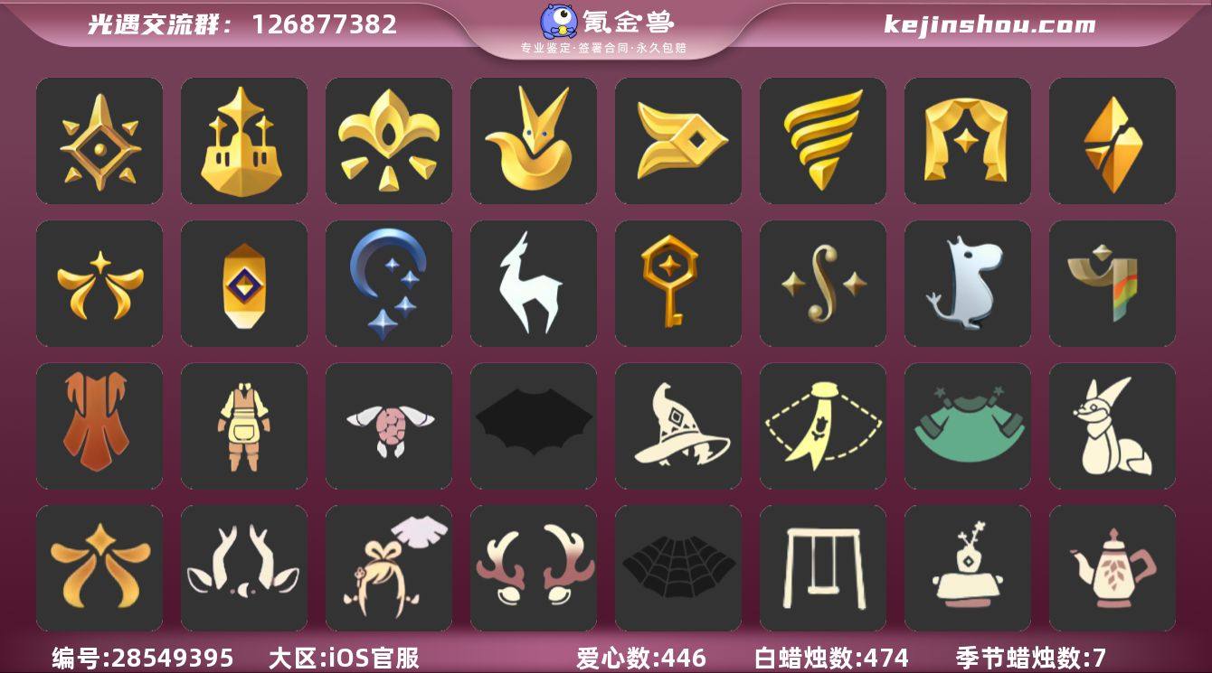 账号类型: 手机账号 季节已毕业: 预言季,梦想季,小王子季,风行季,潜海季,表演季,破晓季,欧若拉季,集结季,夜行季,追忆季,九色鹿季,筑巢季,二重奏季,姆明季,彩染季 完成地图: 全图毕业 珍稀物品: 阿努比斯(狗头),白枭,透明蝶翼斗,玫瑰花 礼包: 蝙蝠套,巫师,围巾,星球斗,小狐狸,欧若拉之翼,九色鹿角,绊爱,鹿角,蜘蛛斗,秋千,茶桌,茶壶,餐桌,白绒金,瑞雪,女巫裙,福娃,跷跷板,小船,吉他,灯笼,奔跑裤子,致爱装扮,人声乐器,鲤鱼套,彩虹帽,雪花球,绒帽,橘子,贝壳,黄伞,兔子,南瓜,枯角,雪花,鲤鱼,tgc,水母,猫套,猫背饰,星月头饰,彩虹耳钉,彩虹耳机,雪怪斗,新年裤,蝴蝶结,四叶草,暗彩装扮,向日葵套,创始人,海蓝波浪发型,海龟斗篷,园丁装扮,奉献斗篷 裤子: 武士裤 亮点: 重塑药水117