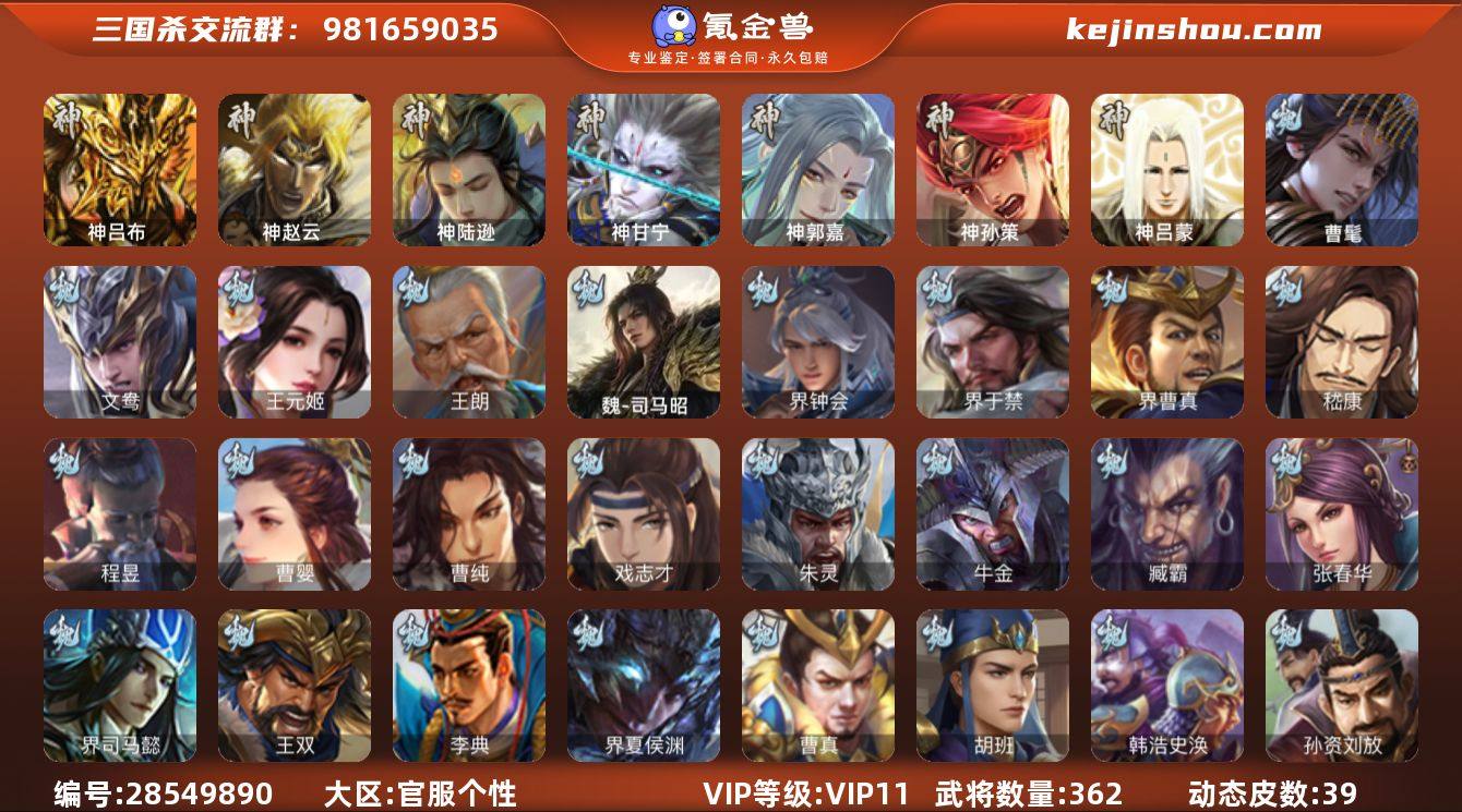 VIP等级: VIP11 官阶: 大将军 武将数量: 362 动态皮肤数量: 39 神将: 神甘宁,神郭嘉,神陆逊,神吕布,神孙策,神赵云,神吕蒙 魏国武将: 戏志才,曹纯,曹婴,程昱,嵇康,界曹真,界于禁,界钟会,魏-司马昭,王朗,王元姬,文鸯,张辽,SP蔡文姬,SP曹仁,SP关羽,SP贾诩,SP姜维,SP庞德,卞夫人,蔡贞姬,曹昂,曹操,曹冲,曹洪,曹丕,曹仁,曹叡,王异,张恭,鲁芝,界满宠,曹休,界曹植,满宠,荀攸,王基,钟繇,郭嘉,牵招,荀彧,阮慧,杜畿,界郭嘉,崔琰,界曹丕,界荀彧,朱灵,吕虔,界陈群,界王异,界许褚,界郭淮,华歆,陈群,界典韦,袁涣,李通,乐进,辛宪英,郭淮,界曹彰,郭皇后,夏侯惇,曹植,司马朗,界曹操,许褚,界张辽,谋徐晃,张郃,钟会,文聘,曹彰,界夏侯惇,诸葛诞,司马懿,甄姬,界徐晃,徐晃,孙资刘放,韩浩史涣,胡班,曹真,典韦,界夏侯渊,谋荀彧,夏侯渊,李典,于禁,王双,邓艾,界司马懿,张春华,臧霸,牛金,朱灵(国战),曹髦 蜀国武将: 关索,花鬘,张星彩,赵襄,谋马超,谋赵云,谋黄忠,马云騄,徐庶,界魏延,杨仪,吕凯,界关羽,界诸葛亮,邓芝,界伊籍,严颜,界黄月英,界张嶷,赵云,张松,李丰,界刘备,界刘禅,刘封,糜竺,谋庞统,黄月英,关羽,吴懿,吴班,界廖化,祝融,张飞,黄皓,陈震,魏延,界周仓,马忠,界法正,糜夫人,界孟获,刘禅,界赵云,谋诸葛亮,张翼,界祝融,SP孙尚香,SP徐庶,卧龙诸葛,宗预,周仓,简雍,界关兴张苞,诸葛亮,孙乾,界张飞,界卧龙诸葛,法正,赵统赵广,陈到,界马岱,关平,马岱,界庞统,庞统,诸葛果,谋张飞,马谡,马超,霍峻,廖化,关兴张苞,孟获,夏侯氏,姜维,黄忠,刘备,界马超,李严,马良,傅肜,蒋琬费祎,许靖,刘谌,甘夫人,SP甘夫人,势陈到 吴国武将: 贺齐,界徐盛,留赞,骆统,孙寒华,文鸯,潘濬,周泰,全琮,吕蒙,诸葛恪,界孙尚香,大乔小乔,桥公,谋周瑜,许贡,丁奉,界全琮,孙茹,蒋钦,顾雍,阚泽,孙亮,界朱治,孙休,严畯,界孙权,界孙休,界凌统,祖茂,濮阳兴,界吕蒙,孙登,界孙策,凌操,朱...