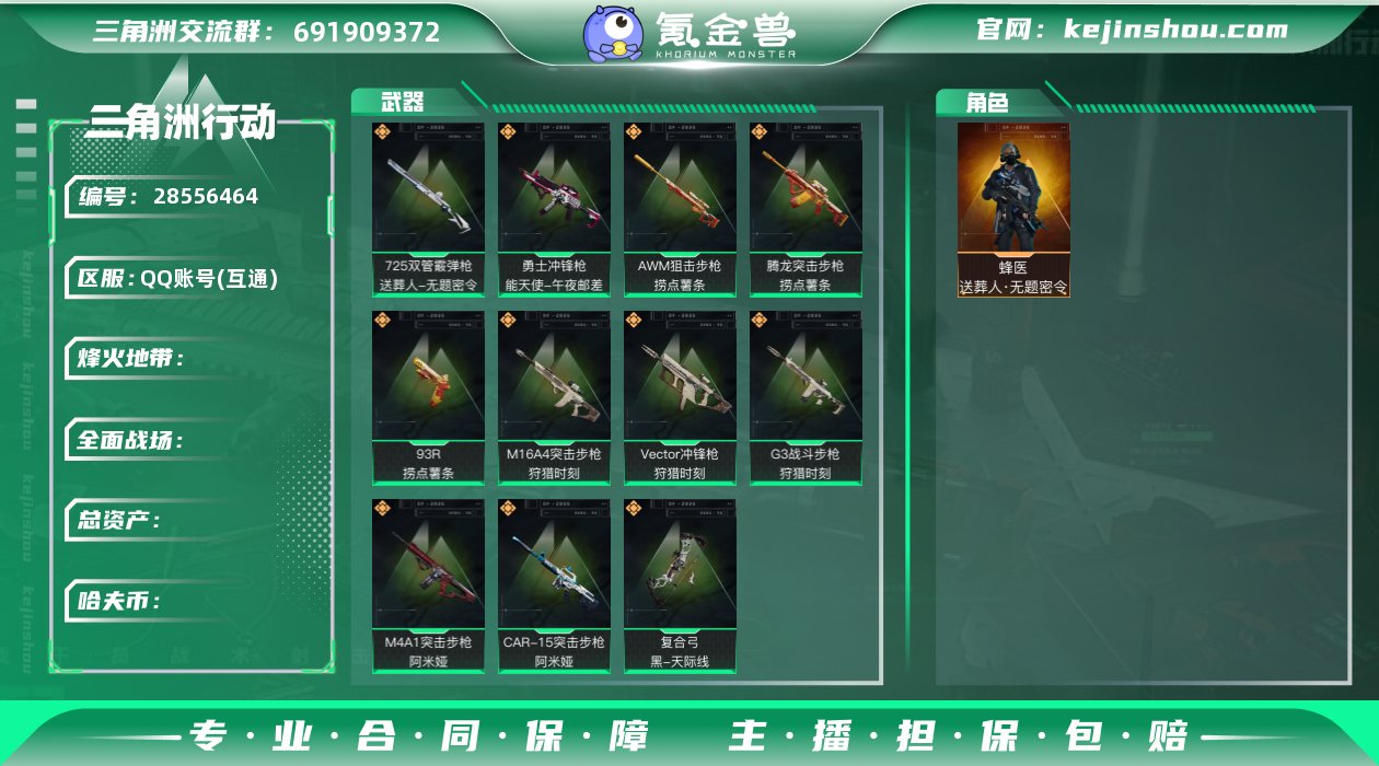 特价秒杀 YXB 不可二次【总资产405.6m 流动资产401.8m 哈夫币2.3亿】【AWM子弹*20 卫星锅*13 非洲之心*1 高级咖啡豆*3】【部门11211 特勤处仓库6 训练中心4 靶场0】【蜂医-送葬人】【联动 M4A1突击步枪-阿米娅 M16A4突击步枪-狩猎时刻 G3战斗步枪-狩猎时刻 联动CAR-15突击步枪-阿米娅 腾龙突击步枪-捞点薯条 Vector冲锋枪-狩猎时刻 联动 勇士冲锋枪-能无使-午夜邮差 联动 725双管霰弹枪-送葬人 AWM狙击步枪-捞点薯条 93R-捞点薯条 联动 复合弓-黑-天际线 】