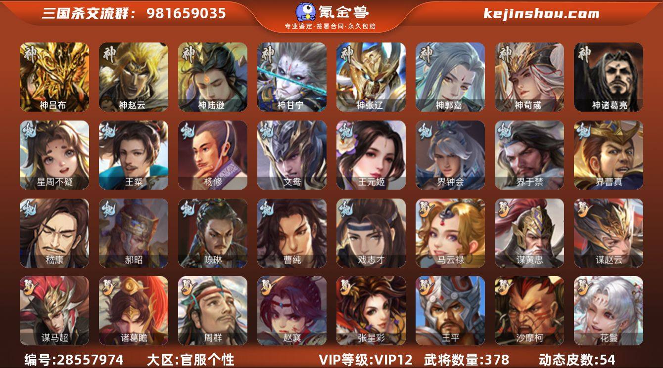 官阶:大将军;VIP等级:VIP12;史诗武将数量:55;动态皮肤数量:43;武将总数:418;史诗宝珠数量:0;将魂数量:776;神将:9;魏国史诗武将:24;蜀国史诗武将:10;吴国史诗武将:10;群史诗武将:14 神吕布,神赵云,神刘备,神甘宁,神张辽,神郭嘉,神太史慈,神孙策,神荀彧,曹髦,王粲,杨修,马钧,界于禁,界曹真,嵇康,郝昭,陈琳,曹婴,曹纯,戏志才,程昱,关索,谋诸葛亮,马云騄,谋赵云,谋马超,诸葛瞻,赵襄,张星彩,王平,花鬘,谋孙策,孙寒华,骆统,留赞,界朱然,界徐盛,界步练师,贺齐,文鸯,左慈,杨彪,星黄忠,陶谦,苏飞,麹义,祢衡,刘焉,沮授,界李儒,公孙康,杜预,许攸,兀突骨,神吕蒙,神周瑜,势夏侯尚,SP关羽,SP曹仁,SP蔡文姬,乐进,曹昂,诸葛诞,朱灵,文聘,SP姜维,张春华,钟会,曹冲,郭淮,满宠,界王异,界曹操,界司马懿,界夏侯惇,界张辽,界许褚,界郭嘉,李典,曹真,韩浩史涣,陈群,曹叡,曹休,钟繇,司马朗,王基,李通,郭皇后,孙资刘放,辛宪英,界甄姬,吕虔,鲁芝,蒯越蒯良,界典韦,界荀彧,界徐晃,杜畿,界曹丕,毌丘俭,界邓艾,张恭,界曹植,界曹彰,界满宠,界郭淮,卞夫人,辛毗,界陈群,华歆,袁涣,王双,崔琰,毛玠,阮慧,谋徐晃,谋于禁,界曹休,牵招,谋夏侯渊,牛金,界夏侯渊,臧霸,唐咨,董昭,SP孙尚香,关银屏,夏侯霸,马良,关兴张苞,廖化,界马岱,关平,简雍,刘封,界法正,界关兴张苞,界刘备,界关羽,界张飞,界赵云,界马超,SP徐庶,吴懿,周仓,张松,刘谌,夏侯氏,糜竺,马忠,孙乾,李严,黄皓,吴苋,秦宓,界黄月英,界诸葛亮,赵统赵广,严颜,界伊籍,界卧龙诸葛,界庞统,界孟获,陈到,界姜维,界刘禅,胡金定,吕凯,张翼,杨仪,界廖化,邓芝,傅肜,界简雍,陈震,费祎,糜夫人,王甫赵累,界周仓,许靖,向宠,宗预,界吴懿,彭羕,界张嶷,谋姜维,谋张飞,吴班,诸葛果,界魏延,蒋琬费祎,甘夫人,鲁肃,孙茹,凌操,大乔小乔,诸葛恪,诸葛瑾,孙鲁育,程普,韩当,潘璋马忠,虞翻,朱然,界周泰,界甘宁,界吕蒙,界...