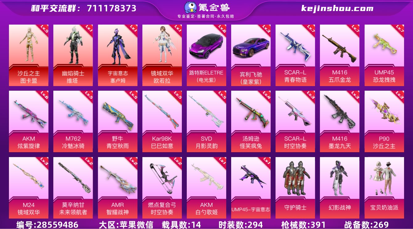 【商品标题】:苹果 微信-30粉装-24特效枪-14载具-177155热力值-29印记-294套装-391枪皮 【红色载具】:路特斯ELETRE(电光紫)(六级),宾利飞驰(皇家紫)(三级) 【红色神装等级】:幽焰骑士-维塔(一级),宇宙意志-塞卢姆(一级),镜域双华-欧若拉(一级),沙丘之主-图卡盟(五级) 【红色角色神装】:幽焰骑士-维塔,宇宙意志-塞卢姆,镜域双华-欧若拉,沙丘之主-图卡盟 【热门品类】:绝对防御上衣,套装-深海小丑鱼,套装-小丑鱼,套装-忍者信条,套装-星河浪客,套装-SS1特训,套装-六号树人 【粉色载具】:兰博基尼Aventador SVJ(翡翠绿),兰博基尼URUS(明艳黄),阿斯顿马丁DBS(绿),路特斯ELETRE(电光紫),宾利飞驰(皇家紫),天马凌跃(星芒橙),冰辰御座(神秘蓝),幽澜尊爵(静谧蓝),合金龙骨(绿),杜卡迪 Panigale V4(星耀白),疾风龙骑,鬼马风驰,空客H135-蔚蓝之翼,星梦玉骢,冰绡玉鳞 【粉色套装】:粉装-守护骑士,粉装-幻影战神,粉装-宝贝奶油派,粉装-天使彩虹糖,粉装-土曜战麒,粉装-雪国幻梦,粉装-蝶舞迷情,粉装-梦幻火箭,粉装-金属狂野,粉装-缤纷油彩,粉装-甜蜜誓约,粉装-草莓生巧,角色-洛天依,粉装-吟月归客,粉装-恐龙拽拽,粉装-冷魅冰骑,粉装-赤焰黑爵,粉装-紫电风暴,角色-白勺歌姬,角色-呆萌星弥,角色-小可学妹,角色-烟云彩露,角色-星梦奇缘,角色-守护天翼,粉装-未来领航者,角色-月影灵韵,角色-智耀战神,粉装-幻彩电音,角色-奇迹舞步 美雪,角色-花灵 【粉色枪皮等级】:AKM-炫紫旋律(六级),AKM-白勺歌姬(一级),SCAR-L-青春物语(七级),SCAR-L-时空协奏(三级),M416-五爪金龙(七级),M416-墨龙九天(三级),M762-冷魅冰骑(五级),UMP45-恐龙拽拽(七级),UMP45-宇宙意志(一级),Vector-最终圣卫者(三级),汤姆逊-怪笑疯兔(四级),野牛-青空秋雨(...