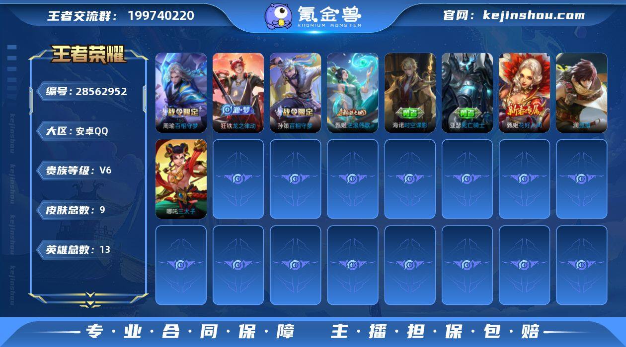 实名: 可修改 性别: 男号 贵族等级: V6 英雄数: 13 皮肤数: 9