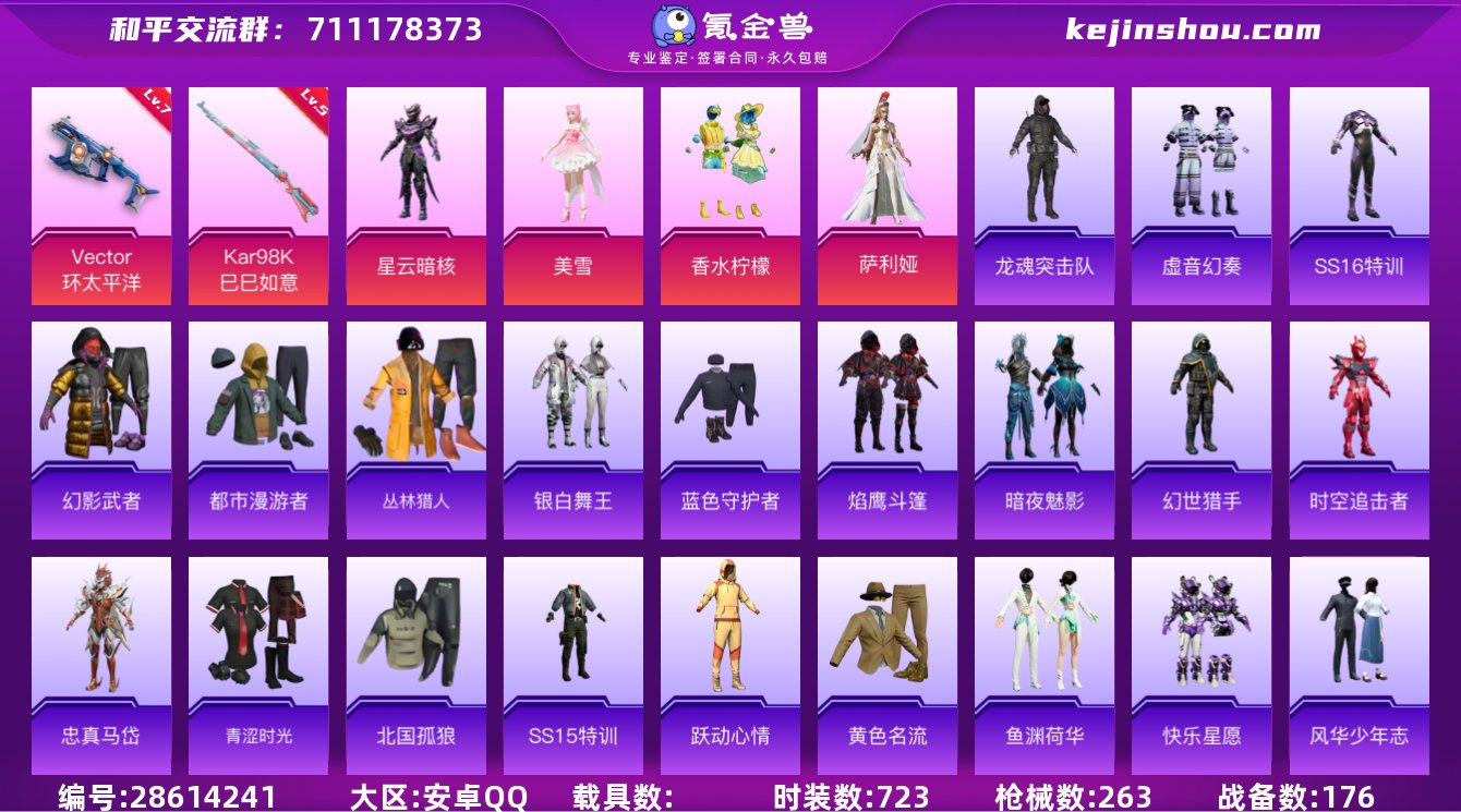 实名:可修改 时装数:723 枪械数:263 战备数:176 美雪,萨利娅,香水柠檬,星云暗核 七级Vector-环太平洋,五级Kar98K-巳巳如意 卖家说:皮肤也挺多的
