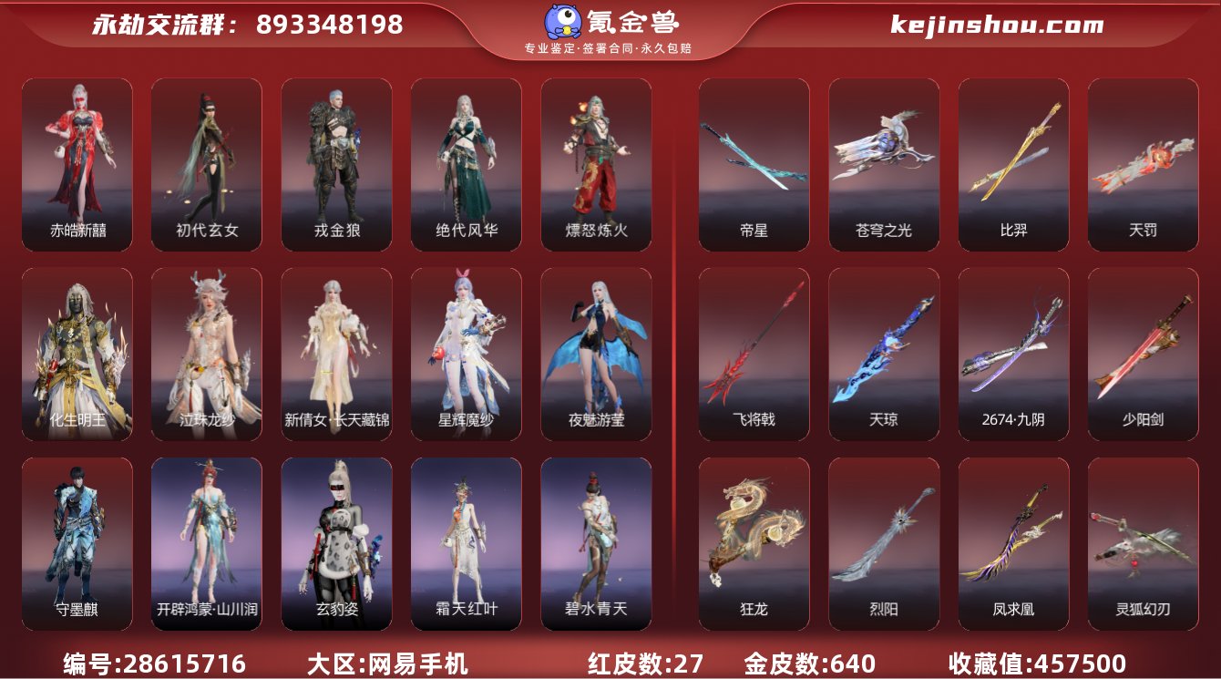 换绑冷却:无冷却 网易支付状态:未注册 收藏值:457500 红皮数:27 黄皮数:640 是否绑定手游账号:未绑定手游 赤皓新囍,初代玄女,戎金狼,绝代风华,熛怒炼火,化生明王,泣珠龙纱,长天藏锦,星辉魔纱,夜魅游莹,守墨麒 帝星,苍穹之光,比羿,天罚,飞将戟,天琼,2674·九阴,少阳剑,狂龙,烈阳,凤求凰,灵狐幻刃,狼主,灵犀,毕方 卖家说:27红贱卖