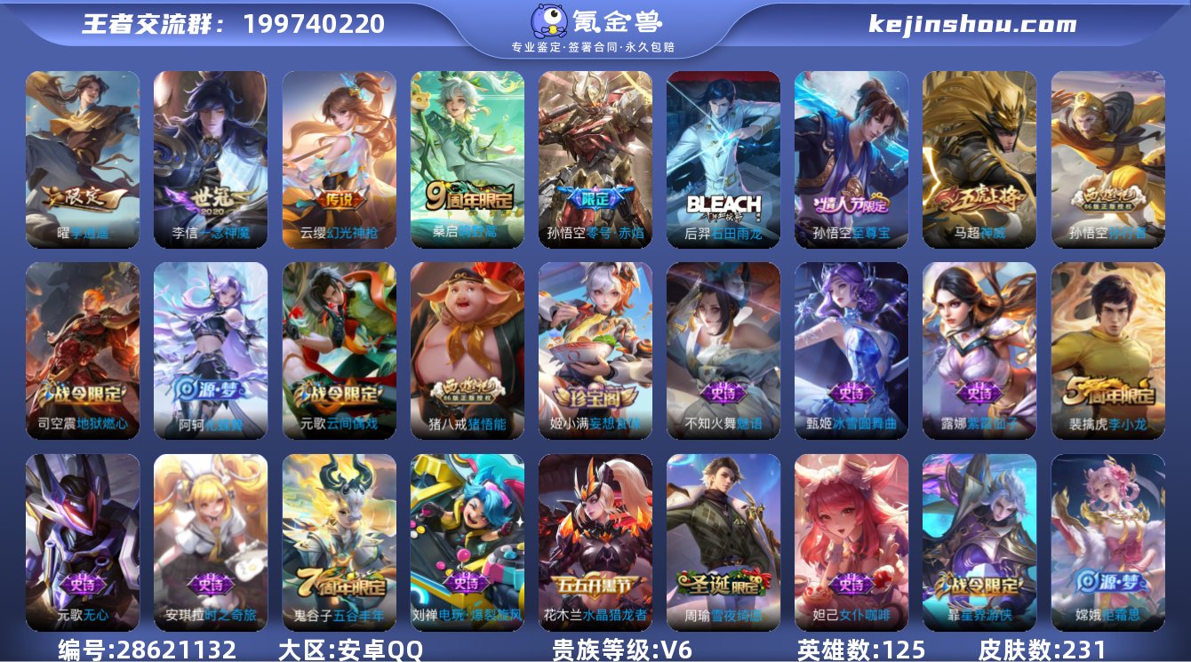 实名:可修改 贵族等级:V6 英雄数:125 皮肤数:231 典藏皮肤数:0 无双皮肤数:0 珍品传说皮肤数:0 传说皮肤数:5 史诗皮肤数:74 段位:星耀 卖家说:V6 5传说 125英雄 230皮肤 可修改实名 优质装备:一念神魔,零号·赤焰,李逍遥 传说皮:幻光神枪 珍宝阁皮:妄想食味,女武神,玩趣恶龙 限定皮:鸣野蒿,至尊宝,神威(电光马子),遇见飞天,高山流水,五谷丰年,游园惊梦,梁祝,天狼溯光者,李小龙,孙行者,猪悟能 史诗皮:化蝶舞,星界战将,石田雨龙,紫霞仙子,黄金分割率,特工魅影,千年之狐,电玩·爆裂旋风,江河有灵,雪夜绮愿(周瑜),百解令(蒙犽),蒙恬荣光圣徽,魅语,冰冠公主,猫狗日记-孙策,猫狗日记-大乔,乱世虎臣,节奏热浪,女仆咖啡,摇滚巨星,水果甜心,天才门将,星夜王子荣耀水晶的幸运值320抽,马上就出来了