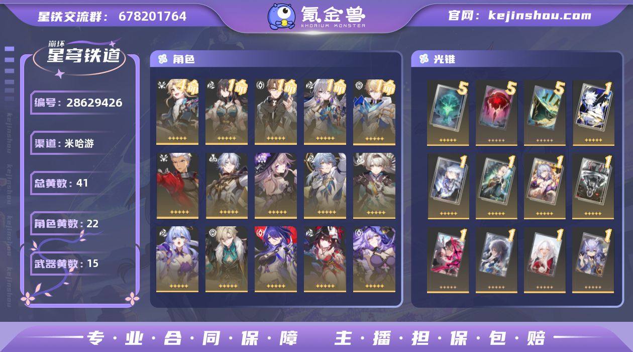 T编号x8890 总黄数: 41 4命金色角色: 4命彦卿 1命金色角色: 1命瓦尔特,1命布洛妮娅,1命杰帕德,1命阮•梅 0命金色角色: 0命白露,0命姬子,0命克拉拉,0命罗刹,0命丹恒•饮月,0命银枝,0命真理医生,0命黑天鹅,0命花火,0命黄泉,0命砂金,0命知更鸟,0命流萤,0命星期日,0命大黑塔,0命白厄,0命Archer 精5武器: 精5记一位星神的陨落,精5星海巡航,精5不息的演算 精1武器: 精1时节不居,精1如泥酣眠,精1以世界之名,精1但战斗还未结束,精1无可取代的东西,精1孤独的疗愈,精1行于流逝的岸,精1夜色流光溢彩,精1梦应归于何处,精1回到大地的飞行,精1记忆永不落幕,精1黎明恰如此燃烧