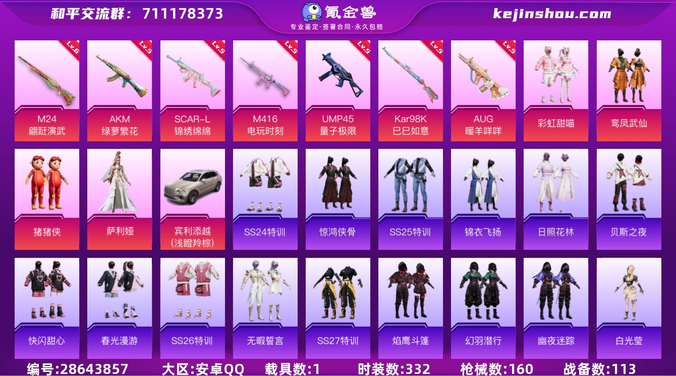 1载具 7升级枪 4粉装 160枪皮 90套装 46784热力 9印记 星钻 宾利添越(浅瞪羚棕) 六级M24-翩跹演武 五级M416-电玩时刻,五级SCAR-L-锦绣绵绵,五级AKM-绿萝繁花,五级UMP45-量子极限,五级Kar98K-巳巳如意,五级AUG-暖羊咩咩 鸾凤武仙,彩虹甜喵,猪猪侠,萨利娅