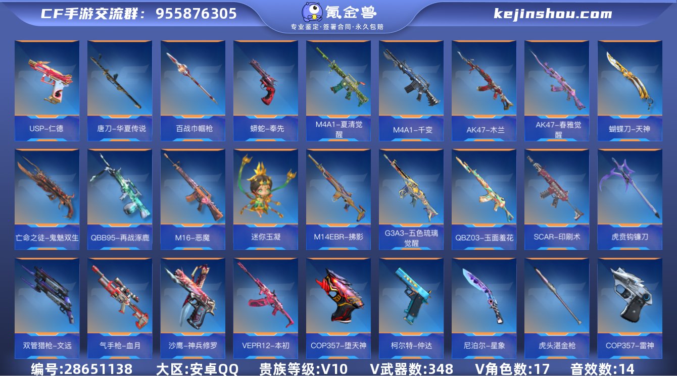 实名:可修改 贵族等级:V10 v武器数:348 王者武器数:66 V/王者角色数量:17 音效卡数:14 蝶至尊,怒至尊,心至尊,力至尊,戮至尊,影至尊,神至尊,势至尊,翼至尊,烈至尊,魄至尊 USP-仁德,唐刀-华夏传说,百战巾帼枪,蟒蛇-奉先,M4A1-夏清觉醒,M4A1-千变,AK47-木兰,AK47-春雅觉醒,蝴蝶刀-天神,亡命之徒-鬼魅双生,QBB95-再战涿鹿,M16-恶魔,迷你玉凝,M14EBR-拂影,G3A3-五色琉璃觉醒,QBZ03-玉面羞花,SCAR-印刷术,虎贲钩镰刀,双管猎枪-文远,气手枪-血月,沙鹰-神兵修罗,VEPR12-本初,COP357-堕天神,柯尔特-仲达,尼泊尔-星象,虎头湛金枪,COP357-雷神,COP357-星象,COP357-雷霆,USP-雷暴,黑龙魂,汤姆逊-烈龙,AWM-游骑兵,巴雷特-定军,AWM-妙才,M200-幻神,TAC-慈,M4A1-游骑兵,AK47-游骑兵,M4A1-星象,AK47-奉先,M4A1-仲达,AK47-孟德,SCAR-文远,M4A1-竞界荣光,SKS-美杜莎,M4A1-七色宝葫,MK47-仁德,M4A1-运输船,AK47-华夏传说,M4A1-心动次元觉醒,M4A1-心动次元,M4A1-破空冰刃,MK47-云舞,81式-光明之神,M4A1-海骑士,AK47-血武士,MK47-机械纪元,AK47-雷麒麟,AK47-心动次元觉醒,AK47-燎天净火,M4A1-雷霆,AK47-沙漠郡主-二觉,AK47-猩红传说,QBZ03-死神,M14EBR-天神,AK47-泰坦破坏者III,AK47-幸运日觉醒,AK47-天使,AUG-机械纪元,9A91-游骑兵,AK47-黑鲨,M4A1-龙血,AK47-竞技战魂,AK47-机械迷城,AK47-变色龙,AK47-樱斗士-超觉,SCAR-幽暗骑士觉醒,M4A1-变色龙,M4A1-威侯,M4A1-Rush-夜袭,AK47-Rush-星速,QBZ03-金色蔷薇,M4A1-樱龙·二觉,M4A1-竞技战魂,AK47-冰魂觉醒,M4A1-卧龙觉醒,M4A1-武圣,M4A1-君威GS,M4A1-沙漠领主,AK47-耀金伯爵,AK47-角斗士,AN94-超新星,QBZ03-湮灭,AK47-牡丹精灵,AK12-天启,SCAR-幽暗骑士,QBZ95-天使,9A91-死神,AK47-沙漠领主,M4A1-玫瑰精灵,M14EBR-暗夜,AK47-黑武士觉醒,M4A1-死神,剑齿虎,M4A1-黑龙,AK47-麒麟,M4A1-黑骑士,M4A1-雷神,AK47-火麒麟,AK47-无影,巴雷特-冬灭觉醒,巴雷特-冬灭,98K-血月,M200-心动次元觉醒,M200-心动次元,巴雷特-雷霆,MR1-龙吟惊沧海,AWM-天使,98K-黑骑士,AWM-裁决,巴雷特-变色龙,巴雷特-金色蔷薇,AWM-天龙-曼陀罗,AWM-赛博时代,09式狙-天神,巴雷特-枪娘,巴雷特-雷神,暗杀神,巴雷特-极光,巴雷特-毁灭,AWM-天龙,刘易斯-血月,加特林-蟒蛇,刘易斯-天使,MG36-黑骑士,加特林-堡垒觉醒,加特林-炼狱,MG3-雏凤,加特林-堡垒,RPK-赤炎盘龙,CZS2-心动次元觉醒,CZS2-心动次元,MK5-极光,QCW05-未来战士,斯泰尔-恶魔,MK5-机械纪元,双持斯泰尔-天使,寒霜烈龙,毁灭征服者-超越Max,KSG-火力竞放觉醒,贝雷塔-力拔山河,KSG-天蓬元帅,AA12-雷神,KSG-天使,KSG-黑骑士,亡命之徒-幻兽,地狱烈樱·超觉,地狱烈炎,嗜血金鲨,地狱火,USP
