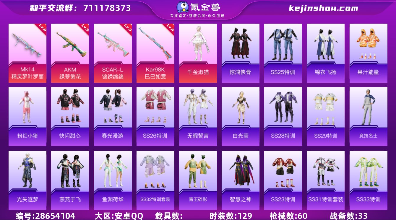 安卓Q-16434热力值 历史不朽星钻Ⅲ 33套装 60枪皮 【1粉装】 千金淑猫 【4特效枪】 SCAR-L-锦绣绵绵 (5级) AKM-绿萝繁花 (5级) Kar98K-巳巳如意 (4级) Mk14-精灵梦叶罗丽 (6级) 【1热门】 粉红小猪 营地ID:1029695859