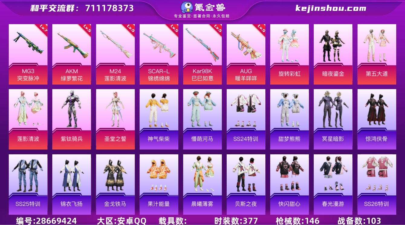 6升级枪 6粉装 146枪皮 100套装 47592热力 6印记 星钻 七级MG3-突变脉冲 五级SCAR-L-锦绣绵绵,五级M24-莲影清波,五级AKM-绿萝繁花,五级Kar98K-巳巳如意,五级AUG-暖羊咩咩 旋转彩虹,暗夜鎏金,第五大道,莲影清波,紫钛骑兵,圣堂之誓 甜梦熊熊,神气柴柴,懵萌河马,SS24特训,冥星暗影,金戈铁马,锦衣飞扬,SS25特训,惊鸿侠骨,果汁能量,晨曦薄雾,SS26特训,春光漫游,快闪甜心,贝斯之夜,彩霞狙击,无暇誓言,明鸳圣池,纯真浪花,热情海星,SS28特训,粉日山川,雏菊兔兔,萝兰蝴蝶,SS29特训,星途旅人,竞技名士,玉兔迎春,巳巳如意,森林游猎者,智谋强哥,蜜桃派对,恋语绒绒,猎影月神,青玉碎影,绯格组合,萌黄之夏,耀粉歌者