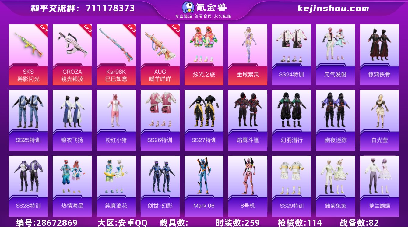 LGH357【4特2粉炫光之旅金域紫灵蓝螳螂-Mark.06粉螳螂-8号机素材号】安卓Q-33493热力值 8王牌印记 历史超级王牌13星 68套装 114枪皮 【2粉装】 炫光之旅 金域紫灵 【4特效枪】 Kar98K-巳巳如意 (5级) AUG-暖羊咩咩 (5级) GROZA-镜光银凌 (5级) SKS-碧影闪光 (7级) 【3热门】 8号机 Mark.06 粉红小猪 【1头盔】 梦幻火箭头盔 【1背包】 梦幻火箭背包 营地ID:952857633