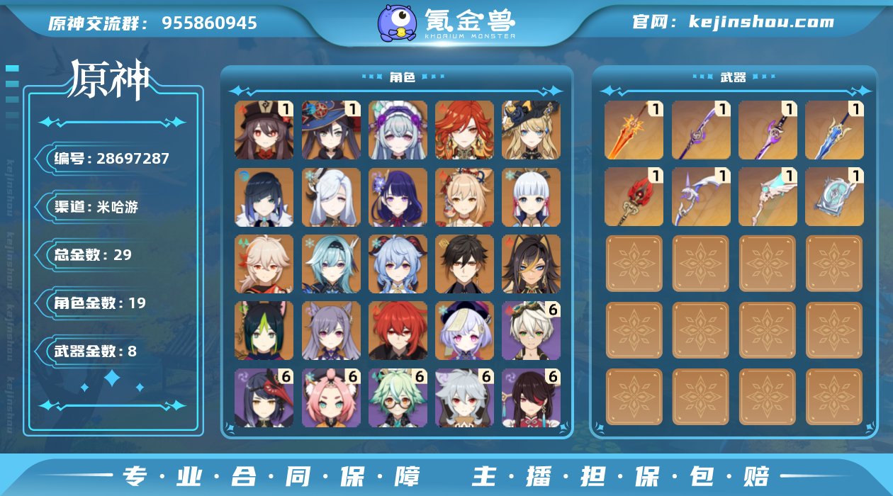 邮箱是否赠送:不送 邮箱:未绑定 总黄数:29 男/女主:女主 1命胡桃,1命莫娜,0命梦见月瑞希,0命玛薇卡,0命娜维娅,0命夜兰,0命申鹤,0命雷电将军,0命宵宫,0命神里绫华,0命枫原万叶,0命优菈,0命甘雨,0命钟离,0命迪希雅,0命提纳里,0命刻晴,0命迪卢克,0命七七 精1焚曜千阳,精1薙草之稻光,精1雾切之回光,精1松籁响起之时,精1护摩之杖,精1阿莫斯之弓,精1天空之翼,精1四风原典 冒险等级:58 卖家说:18五星角色,7五星武器,950原石,58级,急出,角色基本毕业