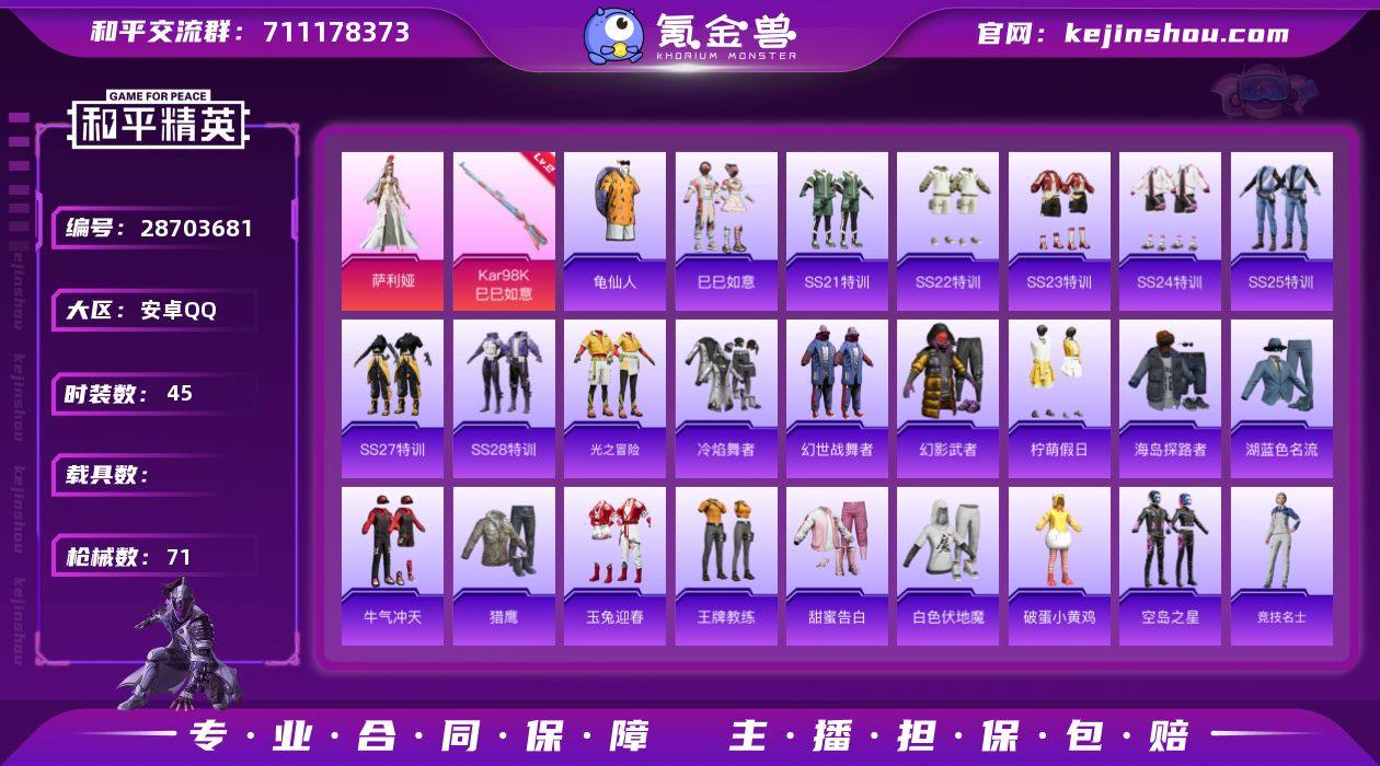 【mhp983】安卓 手Q-1粉装-1特效枪-0载具-0粉色飞行器-17561热力值-4王牌印记-45套装-71枪皮 【热门品类】:套装-龟仙人 【粉色套装】:角色-萨利娅 【粉色枪皮等级】:Kar98K-巳巳如意(二级) 【粉色枪皮】:Kar98K-巳巳如意 【粉色降落伞】:花间之火降落伞,月影灵韵降落伞 【稀有套装】:套装-龟仙人,套装-巳巳如意 【稀有枪皮】:AKM-彩虹符号,AKM-破晓战魂,AKM-龙的传人,SCAR-L-炫彩节奏,SCAR-L-玉兔迎春,SCAR-L-红色方程式,M416-糯团青竹,M416-红色方程式,M416-蓝色火焰,GROZA-彩虹符号,GROZA-田园牧歌,AUG-天降萌叽,AUG-耀粉歌者,M762-天降萌叽,M762-绯红前夜,AC-VAL-天降萌叽,蜜獾-天降萌叽,蜜獾-娇憨猪猪,UZI-天降萌叽,UZI-娇憨猪猪,UZI-红色方程式,UMP45-蓝色火焰,Vector-夜灯,Vector-彩虹符号,Vector-田园牧歌,汤姆逊-炫彩节奏,汤姆逊-耀粉歌者,P90-巳巳如意,Kar98K-红色方程式,SKS-未来歌姬,VSS-彩虹符号,VSS-星之彼岸,VSS-田园牧歌,Mini14-炫彩节奏,Mini14-耀粉歌者,SLR-娇憨猪猪,SLR-彩虹符号,S686-生命誓言,S686-红色方程式,S1897-炫彩节奏,S12K-玩趣呆呆,S12K-破晓战魂,S12K-娇憨猪猪,S12K-幻世战舞者,DBS-彩虹符号,SPAS-12-田园牧歌,M249-破晓战魂,MG3-幻世战舞者,MG3-暗夜行者 【其他套装】:套装-SS21特训,套装-SS22特训,套装-SS23特训,套装-SS24特训,套装-SS25特训,套装-SS27特训,套装-SS28特训,套装-光之冒险,套装-冷焰舞者,套装-幻世战舞者,套装-幻影武者,套装-柠萌假日,套装-海岛探路者,套装-湖蓝色名流,套装-牛气冲天,套装-猎鹰,套装-玉兔迎春,套装-王牌教练,套装-甜蜜告白,套装-白色伏地魔,套装-破蛋小黄鸡,套装-空岛之星,套装-竞技名士,套装-竞技达人朋克,套装-绯格组合,套装-缤纷果语,套装-街头潮人,套...