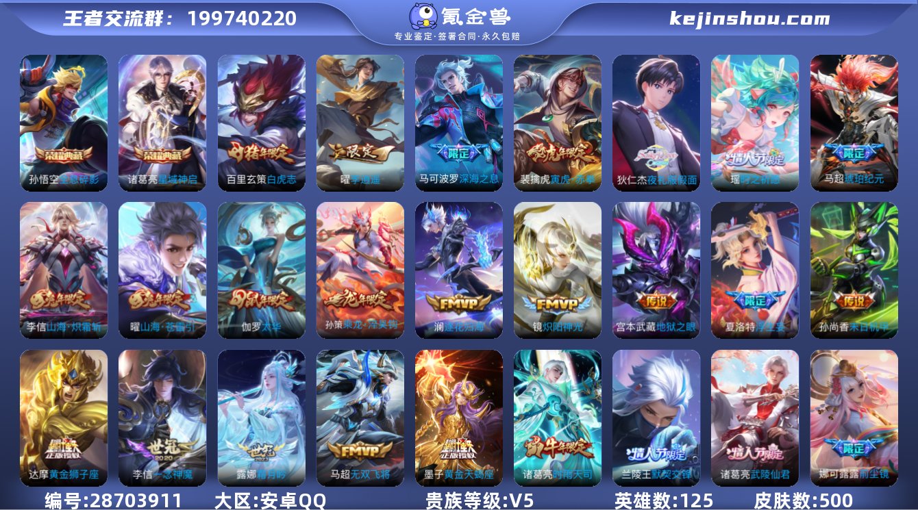 安卓QQ-QQ超级会员还有十多年-有二次-贵10-125英 雄-500皮肤-2典藏-76传说-5星元-193限定-65个性按 键-万战吕布,马克,狄仁杰-14印记-全能大师-满铭文-25万贵族积分-热门皮肤-诸葛亮星域神启,孙悟空全息碎影,墨子黄金夫蝎座,貂蝉曦玄引, 吕布曦玄引,孙策乘龙·淬吴钩,马超琥珀纪元,铠琥珀纪元,澜逐花归海,露娜霜月吟,狄仁杰夜礼服假面,夏洛特浮生妄,干将莫邪画中仙,花木兰燃星之曲