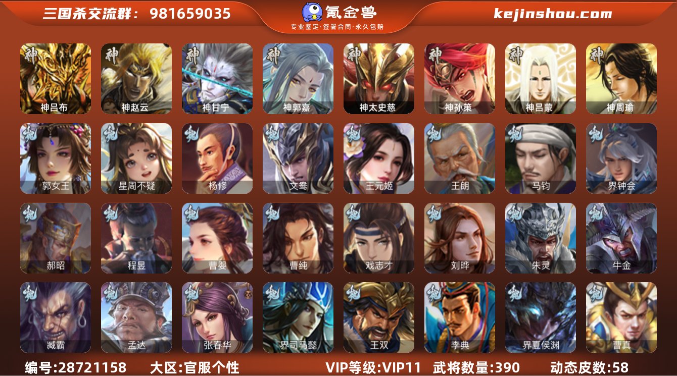 VIP等级: VIP11 官阶: 大将军 武将数量: 382 动态皮肤数量: 46 神将: 神郭嘉,神吕布,神荀彧,神张辽,神赵云,神吕蒙,神周瑜,神诸葛亮,神鲁肃 魏国武将: 戏志才,曹纯,曹婴,程昱,界于禁,界钟会,王元姬,文鸯,杨修,王粲,唐咨-魏,张辽,SP蔡文姬,SP关羽,SP贾诩,SP姜维,SP庞德,卞夫人,蔡贞姬,曹昂,曹操,曹冲,曹洪,曹丕,曹仁,曹叡,曹嵩,王异,鲁芝,界满宠,曹休,界曹植,满宠,荀攸,王基,钟繇,蒯越蒯良,郭嘉,牵招,荀彧,杜畿,界郭嘉,崔琰,界曹丕,界荀彧,朱灵,界甄姬,辛毗,吕虔,界王异,界许褚,界郭淮,华歆,陈群,界邓艾,界典韦,界曹休,司马孚,袁涣,李通,乐进,辛宪英,郭淮,郭皇后,夏侯惇,曹植,司马朗,谋于禁,界曹操,星周不疑,许褚,界张辽,谋徐晃,张郃,钟会,文聘,曹彰,界夏侯惇,诸葛诞,司马懿,甄姬,界徐晃,徐晃,孙资刘放,韩浩史涣,胡班,曹真,典韦,界夏侯渊,谋荀彧,夏侯渊,李典,于禁,王双,邓艾,界司马懿,张春华,孟达-魏,臧霸,牛金,朱灵(国战),文钦-魏,玄·毌丘俭,谋张辽 蜀国武将: 董允,关索,花鬘,界黄忠,沙摩柯,张星彩,赵襄,谋马超,马云騄,徐庶,界魏延,杨仪,吕凯,界关羽,界诸葛亮,邓芝,界伊籍,胡金定,费祎,严颜,界黄月英,界张嶷,赵云,张松,李丰,界刘备,谋姜维,刘封,糜竺,谋庞统,黄月英,刘巴,关羽,吴懿,吴班,祝融,张飞,黄皓,魏延,界周仓,马忠,界法正,糜夫人,界孟获,刘禅,界赵云,关银屏,界祝融,SP孙尚香,SP徐庶,卧龙诸葛,周仓,简雍,界关兴张苞,诸葛亮,界张飞,界卧龙诸葛,法正,赵统赵广,陈到,界马岱,关平,马岱,界庞统,庞统,诸葛果,谋张飞,马谡,马超,霍峻,廖化,关兴张苞,谋关羽,孟获,夏侯氏,姜维,黄忠,刘备,界马超,李严,马良,傅肜,蒋琬费祎,刘谌,甘夫人,蜀-糜芳傅士仁,SP甘夫人,势陈到 吴国武将: 界徐盛,留赞,吴景,文鸯,潘濬,周泰,全琮,吕蒙,诸葛恪,界孙尚香,界顾雍,大乔小乔,谋甘宁,桥公,谋周瑜,界程普,丁奉,谋吕蒙,孙茹,蒋钦,顾雍,阚泽,...
