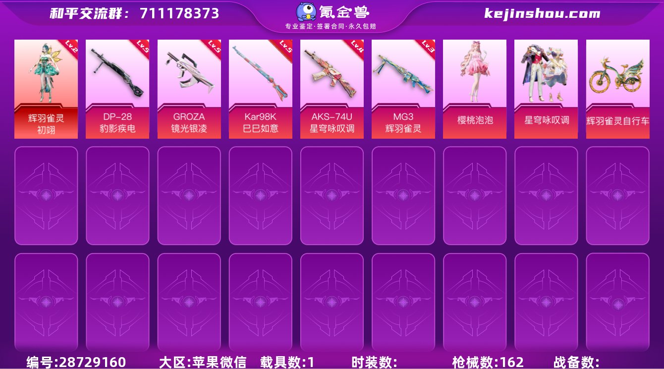ZV2868 苹果微信 可二次 1红装1载具2粉装5特效枪 109套装162枪皮 辉羽雀灵-初翊 (2级) AKM-百万伏特 辉羽雀灵自行车 樱桃泡泡 星穹咏叹调 AKS-74U-星穹咏叹调 (4级) Kar98K-巳巳如意 (5级) MG3-辉羽雀灵 (3级) DP-28-豹影疾电 (5级) GROZA-镜光银凌 (5级) 梦起落英 纯白誓言 粉红小猪 蓝甜马卡龙 破蛋小黄鸡 M249-古堡领主 梦幻火箭头盔 银河战甲背包 46949热力值 12印记 历史绝世王牌26星 和平精英账号