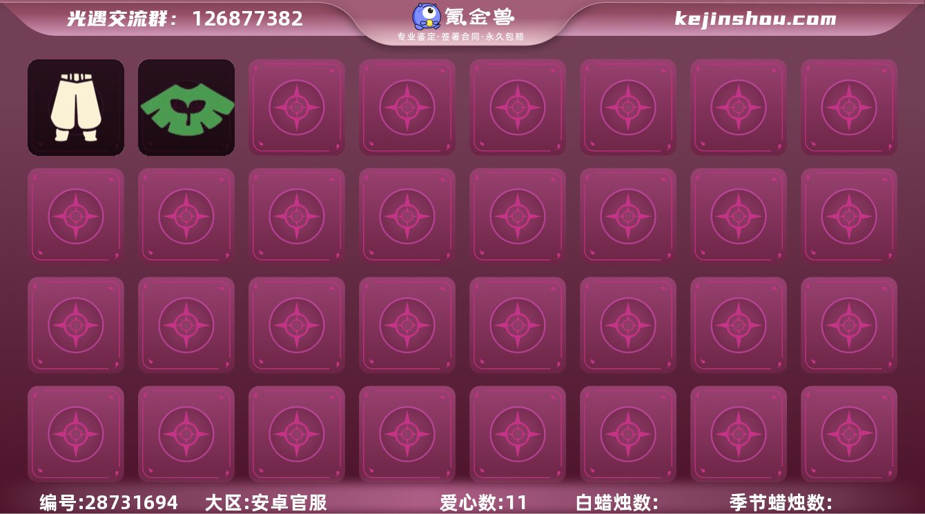 账号类型: 手机账号 季节已毕业: 潜海季,表演季,破晓季,欧若拉季,夜行季,追忆季,拾光季,归巢季,九色鹿季,筑巢季,二重奏季,姆明季,彩染季,青鸟季 完成地图: 晨岛,云野,雨林,霞谷,暮土,禁阁 珍稀物品: 白枭,透明蝶翼斗,彩虹围巾 礼包: 蝙蝠套,巫师,绊爱,鹿角,茶桌,橘子,兔子,向日葵套,透明蛛丝,献瑞折扇礼包 裤子: 武士裤,背带裤,搓澡巾,妮妮裙子,蓝绿裤,飞天裤,筑巢季·裤子,青鸟尊贵蓬头裤子 面具: 呼吸面具,夜行毕业面具,黄眉企鹅面具,辉光羚羊面具 面饰: 红耳机,黑框眼镜,青鸟毕业面饰 项链: 围巾 发型: 归巢毕业发型,若笠,虚荣,单侧绑发,留辫蘑菇头,飞天盘发 头饰: 牛仔帽 斗篷: 绿芽,粉红绒毛斗篷,遥鲲斗篷,燕尾斗篷,冥龙斗篷,彩染围巾斗篷,青鸟毕业斗篷 配饰: 雨伞,筑巢季·小手办,高音钢琴,姆明抱枕,小红伞,相机,二重奏挂画,鲲灯 亮点: 【优质装备】:表演季,白枭(帝企鹅发),武士裤,潜海季,破晓季,透明蝶翼斗,欧若拉季(欧若拉),归巢毕业发型(五塑彩羽发),筑巢季·小手办(光之子试衣),高音钢琴(白色高脚钢琴),夜行季,追忆季,妮妮裙子(妮妮长裙),牛仔帽(西部帽),姆明抱枕,小红伞(姆明红伞)(姆明大伞),相机(季卡相机),拾光季,彩虹围巾(五塑彩带斗),归巢季,九色鹿(九色鹿季),蓝绿裤(高领舞服),飞天裤(柔缎花边连)(九色鹿丝带裤),围巾(肩带),筑巢季,红耳机,晨岛,云野,雨林,霞谷,墓土(暮土),禁阁,若笠(箬笠),青鸟尊贵蓬头裤子(蓝色燕尾服),二重奏季,二重奏挂画(合奏挂画),姆明季,筑巢季·裤子(设计师长袍),呼吸面具(潜水面具),夜行毕业面具(棕熊面具),黄眉企鹅面具,黑框眼镜(粗框眼镜),单侧绑发(单边小辫),留辫蘑菇头,粉红绒毛斗篷(绒毛斗篷),遥鲲斗篷(双翼遥鲲斗),燕尾斗篷,冥龙斗篷,鲲灯(追忆之书),辉光羚羊面具,彩染季,飞天盘发(九色鹿丸子头),青鸟季,青鸟毕业面饰(青鸟面饰),青鸟毕业斗篷(青鸟斗篷),蝙蝠套(蝙蝠斗...
