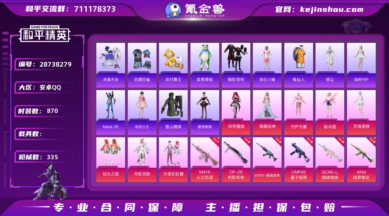 热力值:103981 时装数:870 枪械数:335 战备数:223 绯穹魔姬,脉冲星,守护天翼,天使彩虹糖,炫光之旅,荧海星豚,月影灵韵,智耀战神 七级M416-心之恋语,五级DP-28-豹影疾电,五级AKM-绿萝繁花,五级AMR-智耀战神,五级AUG-暖羊咩咩,五级GROZA-镜光银凌,五级Kar98K-巳巳如意,五级M416-电玩时刻,五级M762-青锋波束,五级SCAR-L-锦绣绵绵,五级UMP45-量子极限,四级Vector-绯穹魔姬,三级AKM-幽焰骑士 拂晓神骑飞行器,鎏金朋克飞行器,灵猫魔法师飞行器,神秘黑猫飞行器,深渊漩涡飞行器,万象金身飞行器,星空武士飞行器,祥瑞起舞飞行器,星之彼岸飞行器,智趣喵喵飞行器,暗夜鎏金降落伞,碧影闪光降落伞,垂柳戏鸭降落伞,脆鲨七海降落伞,动力核心降落伞,绯穹魔姬降落伞,冠军兔兔降落伞,幻星舰长降落伞,金丰海韵降落伞,精灵梦叶罗丽降落伞,临安公主降落伞,冷漠罗丽降落伞,洛神天依降落伞,绮梦流光降落伞,忍者神龟降落伞,圣斗士星矢降落伞,未来歌姬降落伞,未来战士降落伞,炫光之旅降落伞,月影灵韵降落伞,宇宙意志降落伞 元气之梦,喜羊羊,薄荷星砂,SS34特训套装,夜幕侵蚀,游乐,暗黑骑手,暗金炫舞,Alan Walker电音教主,Alan Walker,暗影哥特,冰川特警,冰冻风暴,缤纷果语,滨海厨神,滨海假日,冰河战士,白糯汤圆,白色伏地魔,贝斯之夜,白熊同盟,春光漫游,彩虹兔,雏菊兔兔,长空猛禽,潮流游乐家,春日漫步,超人强,创世·追猎,纯真浪花,顶瓜瓜,蝶变,大橘大利,呆萌铁蟹,都市魅力,飞驰魅影,绯格组合,飞狐塔尔斯,粉红小猪,粉恋花,飞行日记,格斗先锋,诡诞巡游,龟仙人,光之冒险,贵族骑装,幻彩翩翩,红潮炫舞,海岛探路者,鹤鸣,虎虎生威吉莉,湖蓝色名流,黑色伏地魔,黄色伏地魔,黄色名流,海上生明月,黄色运动,红色运动,幻世战舞者,和煦暖阳,湖雨初晴,幻羽潜行,幻影武者,金戈铁马,晶辉守护,酒红色名流,惊鸿侠骨,橘黑制服,娇憨猪猪,竞技达人朋克,竞技角斗士,竞技名士,坚韧舞者,极速红龙,极速竞梦,街头潮人,街头风暴,军械专家,锦衣飞扬,金耀舞者,绛羽幽主,空岛之星,狂花道·娜可露露,快闪甜心,临安公主,蓝冰羽,蓝彩潮人,蓝调潮人,龙的传人,龙魂突击队,猎鹰,鹿角斗士,玲珑飞花,萝兰蝴蝶,黎明保卫者,浪漫天命,蓝色运动,龙腾端午,恋语绒绒,冷焰舞者,乐游熊熊,Mark.06,摩登魅猫,猛禽,妙红点点,棉花软糖,萌黄之夏,米开朗基罗,魅力单车,麻辣教官,懵萌河马,曼妙人鱼,萌趣咩咩,萌趣颜团子,明鸳圣池,卖崽青蛙,霓虹极客,霓虹街区,霓虹热舞,柠萌假日,牛气冲天,浓情蜜辣,牛气满满,派对舞王,破蛋小黄鸡,破晓战魂,青春校园,轻风白浪,绮丽涂鸦,青年教官,青涩时光,青团波波,骑行爱好者,青玉碎影,云朵鹅,荣耀,热情海星,人气偶像,燃烧卡路里,忍者信条,闪电轻猫,深蓝色名流,沙漠兵团,神气柴柴,SS10特训,SS12特训,SS14特训,SS15特训,SS16特训,SS17特训,SS18特训,SS19特训,SS20特训,SS21特训,SS22特训,SS23特训,SS24特训,SS25特训,SS26特训,SS27特训,SS28特训,SS29特训,SS30特训套装,SS31特训套装,SS33特训套装,SS9特训,巳巳如意,探宝勇士,甜蜜告白,甜梦熊熊,特殊使命,涂山之恋,糖糖葫芦,特训学院,田园牧歌,特战英豪,特战装甲,WiFi精灵,完美偶像,王牌教练,小丑鱼,迅捷狂鲨,炫蓝之夏,雪绒豹,旭日情侣,夏日音浪,