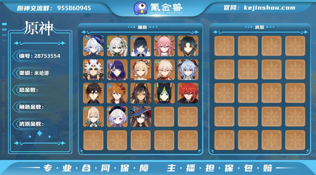 37金 58冒险等级 8金武器 29金人物 飞雷之弦振 若水 和璞鸢 天空之脊 天空之刃 天空之卷 风鹰剑 夜兰 2命雷电将军 宵宫 枫原万叶 钟离 芙宁娜 纳西妲 1命提纳里 八重神子 甘雨 达达利亚 希诺宁 魈 荒泷一斗 2命刻晴 3命七七 琴 1命迪希雅 莫娜 迪卢克 无绑定邮箱N2695