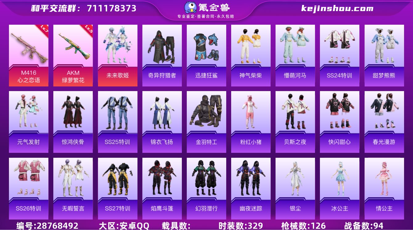 LGH382【2特1粉未来歌姬奇异狩猎者金羽特工迅捷狂鲨素材号】(不可二次) 安卓Q-36967热力值 7王牌印记 历史卓越王牌11星 85套装 126枪皮 【2稀有】 奇异狩猎者 AKM-百万伏特 【1粉装】 未来歌姬 【2特效枪】 M416-心之恋语 (7级) AKM-绿萝繁花 (5级) 【6热门】 迅捷狂鲨 金羽特工 粉红小猪 M762-奇异狩猎者 M24-奇异狩猎者 S686-奇异狩猎者 【1头盔】 百万伏特头盔 【1背包】 深海小丑鱼背包 营地ID:791670776
