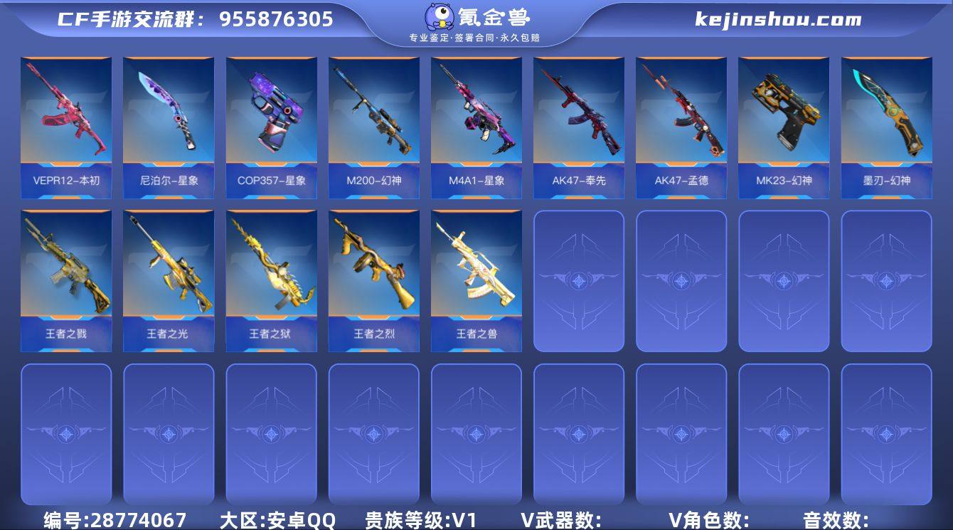 实名: 可修改 贵族等级: V1 v武器: AK47-孟德,AK47-奉先,M4A1-星象,M200-幻神,MK23-幻神,COP357-星象,墨刃-幻神,尼泊尔-星象,VEPR12-本初 王者武器: 王者之戮,王者之烈,王者之光,王者之狱,王者之兽