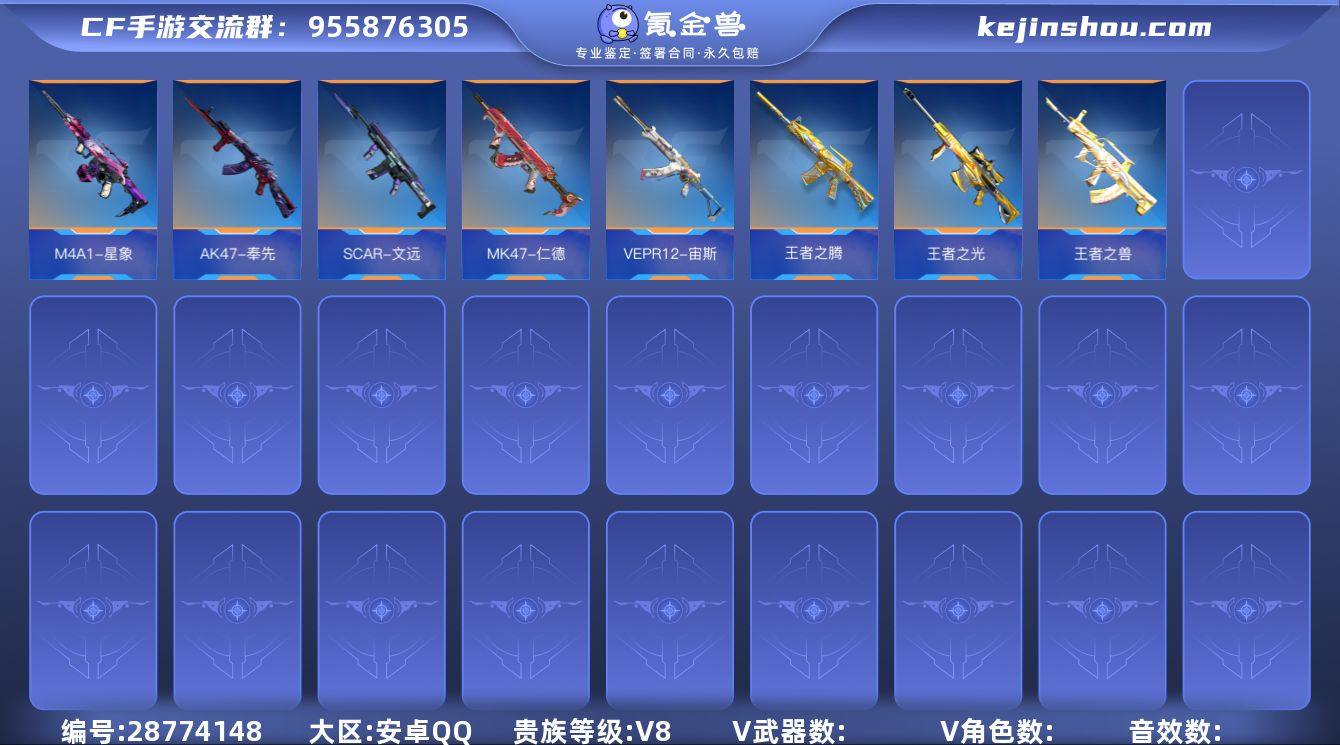 实名: 可修改 贵族等级: V8 v武器: MK47-仁德,SCAR-文远,AK47-奉先,M4A1-星象,VEPR12-宙斯 王者武器: 王者之光,王者之腾,王者之兽