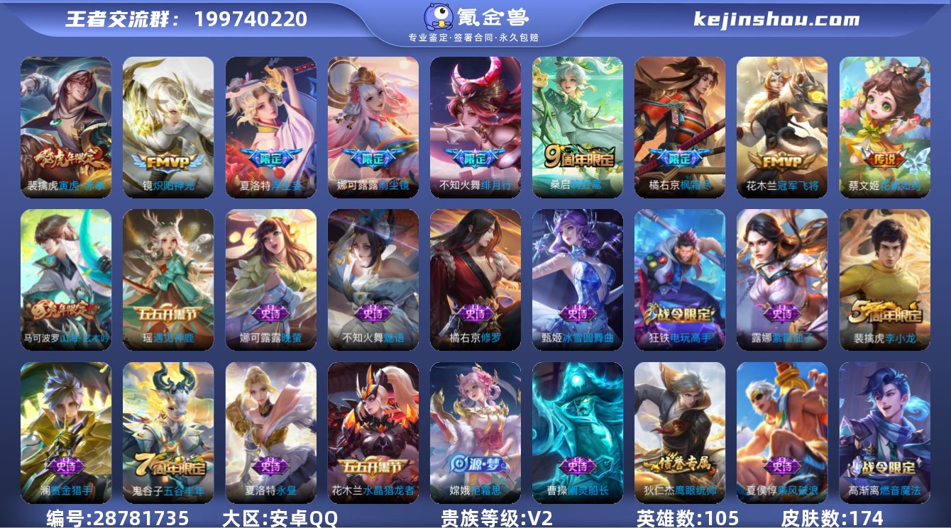 【商品标题】:2.2w大国橘右京,1.87大国夏洛特,1.73大国娜可露露,安卓Q-V2-至尊星耀V段位-105英雄-174皮肤-0典藏-0珍品无双-0无双-0珍品传说-9传说-40史诗 【传说皮肤】:桑启鸣野蒿,夏洛特浮生妄,不知火舞绯月行,橘右京枫霜尽,娜可露露前尘镜,蔡文姬花朝如约,裴擒虎寅虎赤拳,镜炽阳神光,花木兰冠军飞将 【限定皮肤】:姜子牙天穹之誓,狄仁杰阴阳师,赵云皇家上将,嬴政优雅恋人,庄周高山流水,马可波罗山海玄木吟,狄仁杰魔术师,达摩沙漠行僧,项羽海滩派对,王昭君午后时光,兰陵王金庭之子,不知火舞绯月行,娜可露露前尘镜,橘右京枫霜尽,后羿圣弓游侠,李元芳云中旅人,钟馗驱傩正仪,干将莫邪真爱魔法,雅典娜黎明之约,鬼谷子五谷丰年,苏烈千军破阵,百里玄策原初追逐者,梦奇顽趣,沈梦溪大漠名商,裴擒虎李小龙,裴擒虎寅虎赤拳,裴擒虎擒涛扼浪,狂铁电玩高手,嫦娥拒霜思,鲁班大师探海日志,镜匿光追影者,桑启海盐诗旅,夏洛特浮生妄,张良古海寻踪,蒙恬荣光圣徽,高渐离燃音魔法,妲己灵卜魔法,鬼谷子天穹祈灯,刘邦剑破天穹,周瑜熔金海岸 【年限皮肤】:裴擒虎寅虎赤拳,马可波罗山海玄木吟 【赛季限定】:达摩沙漠行僧,兰陵王金庭之子,张良古海寻踪,李元芳云中旅人,钟馗驱傩正仪,雅典娜黎明之约,苏烈千军破阵,百里玄策原初追逐者,梦奇顽趣,沈梦溪大漠名商,裴擒虎擒涛扼浪,鲁班大师探海日志,桑启海盐诗旅,鬼谷子天穹祈灯,蒙恬荣光圣徽,刘邦剑破天穹,姜子牙天穹之誓 【战令限定】:王昭君午后时光,后羿圣弓游侠,干将莫邪真爱魔法,狂铁电玩高手,高渐离燃音魔法,妲己灵卜魔法 【史诗皮肤】:露娜紫霞仙子,赵云皇家上将,貂蝉圣诞恋歌,甄姬冰雪圆舞曲,狄仁杰魔术师,宫本武藏鬼剑武藏,孙尚香水果甜心,嬴政优雅恋人,嬴政摇滚巨星,妲己魅力维加斯,墨子...