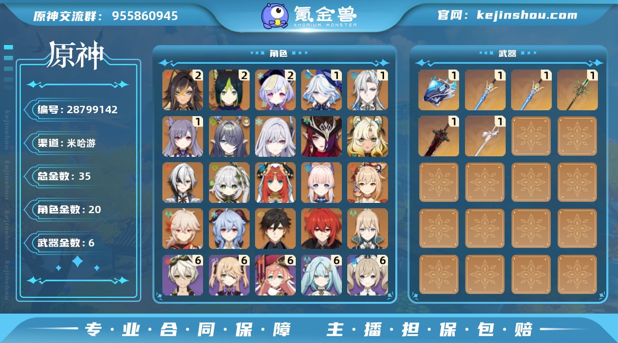 邮箱是否赠送:送 邮箱:未绑定 总黄数:35 男/女主:男主 2命迪希雅,2命提纳里,2命七七,1命芙宁娜,1命那维莱特,1命刻晴,0命菈乌玛,0命丝柯克,0命恰斯卡,0命希诺宁,0命阿蕾奇诺,0命纳西妲,0命妮露,0命珊瑚宫心海,0命宵宫,0命枫原万叶,0命甘雨,0命钟离,0命迪卢克,0命琴 精1万世流涌大典,精1苍古自由之誓,精1和璞鸢,精1狼的末路,精1风鹰剑 冒险等级:59