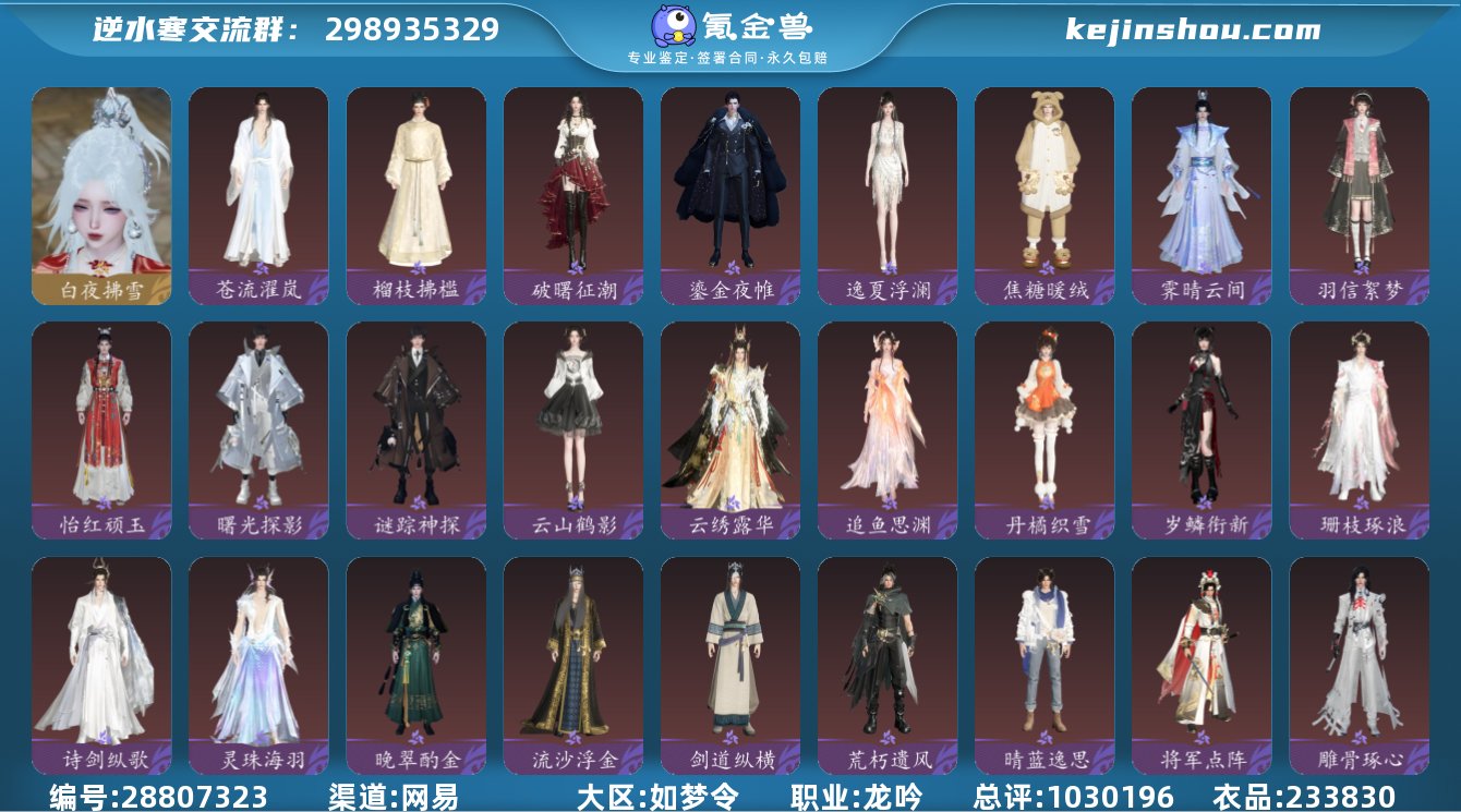 网易支付状态:未注册 换绑冷却:无冷却 职业:龙吟 总评:1030196 衣品:233830 白夜拂雪 苍流濯岚,榴枝拂槛,破曙征潮,鎏金夜帷,逸夏浮澜,焦糖暖绒,霁晴云间,羽信絮梦,怡红顽玉,曙光探影,谜踪神探,云山鹤影,云绣露华,追鱼思渊,丹橘织雪,岁鳞衔新,珊枝琢浪,诗剑纵歌,灵珠海羽,晚翠酌金,流沙浮金,剑道纵横,荒朽遗风,晴蓝逸思,将军点阵,雕骨琢心,星迹漫歌,纯白心绪,灼金喵影,律动音阶,跃动心芒,千星咏叹,岁寒玉骨,灵语星彩,云腾游雾,呱容月貌,云心儒意,丹枫秋意,玄鹰逐日,谁家新燕,竹间萌客,糯粽缠青,风动荷衣,南风知暑,火鸾鸿衣,鲤跃今宵,紫微御宵,蓬海沧歌,帝皇铠甲,贪狼摄星,衣香鬓影,逆鳞浊日,金祷颂晖,青林雀舞,灵兔献瑞,鳞骨逢幽,玄喵夜行,瑞云舒华,鳞纱幻海,斗墨金枢,霜天寒石,金焰追虎,修罗焚天,烽火浮生,天纵红颜,白灵幻尘,灵鹿苍风,极夜天曦,舞乐浮烬,御宇临渊,苍冥玄渊,圣月沉夜,怒踞长霄,白露惑心,素尘凌霜,望夜寒星,花萼盈辉,空林悠萌,牧野星垂,春梢剪锦,花朝春信,吉祥丰禄 骋风叱焰,贺岁喜狮