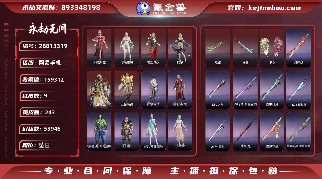 账号有红皮帝星。拳刃最新的红皮等红皮。 金皮很多长剑2674。 财神剑。 水斩马。 灯棍。等。 很多。 8-9个红。 数据也不错