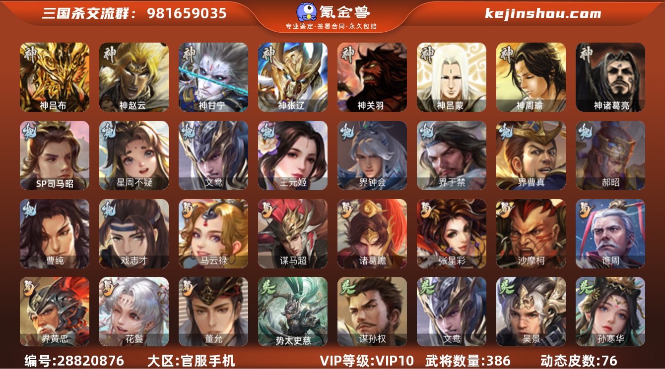 【759】官阶:大将军;VIP等级:VIP11;史诗武将数量:50;动态皮肤数量:47;武将总数:402;史诗宝珠数量:0;将魂数量:549;神将:6;魏国史诗武将:19;蜀国史诗武将:11;吴国史诗武将:7;群史诗武将:15 神赵云,神甘宁,神关羽,神吕蒙,神周瑜,神诸葛亮,SP司马昭,星周不疑,王粲,谋曹操,杨修,文鸯,界钟会,界于禁,界曹真,嵇康,郝昭,陈琳,曹纯,戏志才,关索,马云騄,谋赵云,谋马超,诸葛瞻,张星彩,王平,谯周,界黄忠,花鬘,鲍三娘,谋黄盖,吴景,孙皓,骆统,留赞,界徐盛,贺齐,左慈,张让,星黄忠,陶谦,苏飞,麹义,南华老仙,祢衡,沮授,界左慈,界李儒,杜预,卑弥呼,李傕,许攸,神甘宁-万人辟易(动态),神诸葛亮-风舞魔鸟(动态),神曹操-天下归心,神赵云-战龙在野(动态),SP司马昭-鼠年冬至(动态),钟会-潜蛟觊天(动态),荀彧-驱虎吞狼(动态),邓艾-神兵天降(动态),王粲-笔翰如流(动态),界邓艾-神兵天降(动态),钟会-谋谟之勋(动态),界曹植-鼠年端午(动态),界钟会-谋谟之勋(动态),戏志才-举棋若定(动态),朱灵-以战破氐(动态),花鬘-依心缱绻(动态),费祎-安民护祚(动态),马超-牛年春节(动态),马超-明良千古(动态),黄月英-明良千古(动态),界马超-牛年春节(动态),界黄月英-明良千古(动态),夏侯氏-猪年中秋(动态),关索-鼠年中秋(动态),关索-虎年七夕(动态),鲍三娘-柳娇桃艳(动态),孙策-虎踞江东(动态),孙权-猪年端午(动态),界孙权-猪年端午(动态),孙鲁育-牛年端午(动态),刘赞-灵魂歌王(动态),貂蝉-鼠年七夕(动态),吕布-鼠年七夕(动态),袁绍-一往无前(动态),界吕布-鼠年七夕(动态),界貂蝉-鼠年七夕(动态),界袁绍-一往无前(动态),李儒-鸠杀少帝(动态),界李儒-鸠杀少帝(动态),刘协-龙困于渊(动态)