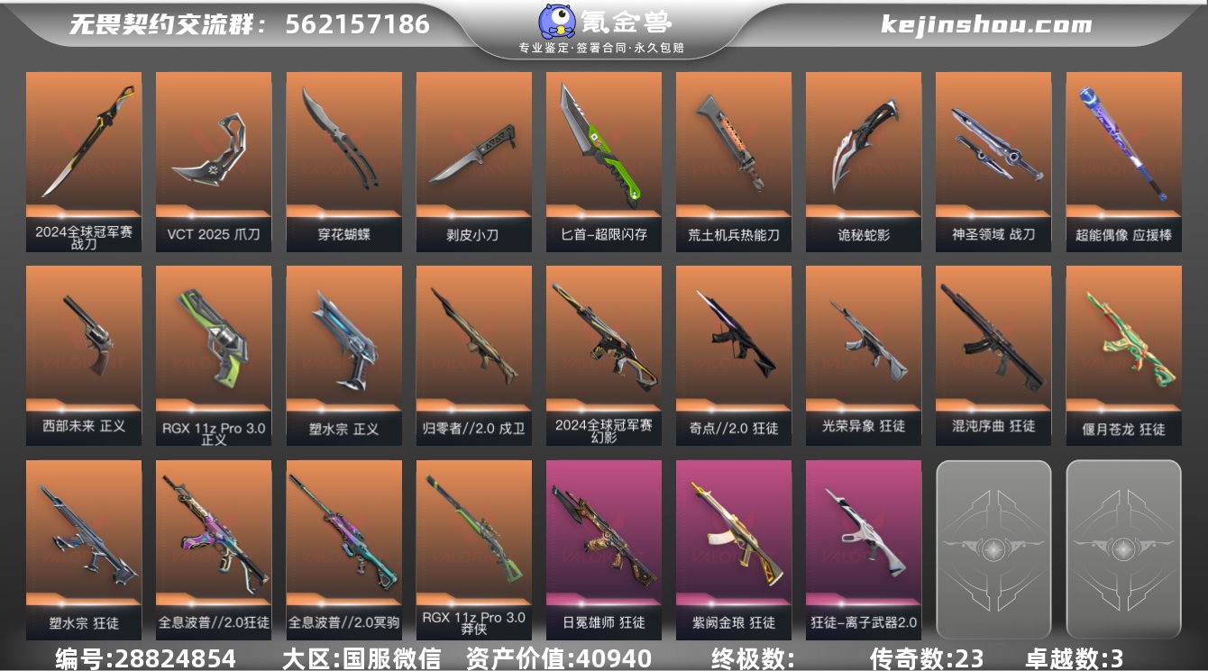 近战武器数量10 皮肤资产价值40940 皮肤数量96 卓越数3 限定数23 使用源晶点数1100 近战武器10 鬼魅4 正义6 标配4 短炮1 狂怒3 蜂刺4 骇灵3 判官4 雄鹿3 獠犬4 戍卫6 幻影6 狂徒12 莽侠4 飞将2 冥驹4 奥丁2 战神3 英雄17 热门喷漆13 套装3 热门卡面16 热门挂饰22 近战武器:近战武器-诡秘蛇影军刀,近战武器-VCT2025爪刀,近战武器-神圣领域战刀,近战武器-荒土机兵热能刀,近战武器-穿花蝴蝶,近战武器-超限闪存匕首,近战武器-剥皮小刀,近战武器-2024全球冠军赛战刀,近战武器-超能偶像应援棒,近战武器-RGX11zPro3.0爪刀; 鬼魅:鬼魅-诡秘蛇影,鬼魅-星云暗涌,鬼魅-模拟赫兹,鬼魅-采蜜小蜂队; 正义:正义-西部未来,正义-月球哨兵,正义-塑水宗,正义-纳米打击,正义-超限闪存,正义-RGX11zPro3.0; 标配:标配-折光棱晶,标配-荒土机兵,标配-浮光跃金,标配-超能偶像; 短炮:短炮-末日之翼; 狂怒:狂怒-神圣领域,狂怒-逆冲蛮牛,狂怒-聚合之力; 蜂刺:蜂刺-折光棱晶,蜂刺-星云暗涌,蜂刺-超限闪存,蜂刺-聚合之力; 骇灵:骇灵-星云暗涌,骇灵-荒土机兵,骇灵-浮光跃金; 判官:判官-诡秘蛇影,判官-纳米打击,判官-超能偶像,判官-采蜜小蜂队; 雄鹿:雄鹿-月球哨兵,雄鹿-逆冲蛮牛,雄鹿-模拟赫兹; 獠犬:獠犬-神圣领域,獠犬-逆冲蛮牛,獠犬-模拟赫兹,獠犬-采蜜小蜂队; 戍卫:戍卫-折光棱晶,戍卫-月球哨兵,戍卫-归零者2.0,戍卫-逆冲蛮牛,戍卫-浮光跃金,戍卫-超能偶像; 幻影:幻影-末日之翼,幻影-神圣领域,幻影-纳米打击,幻影-超限闪存,幻影-2024全球冠军赛,幻影-聚合之力; 狂徒:狂徒-光荣异象,狂徒-紫阙金琅,狂徒-离子武器2.0,狂徒-诡秘蛇影,狂徒-奇点2.0,狂徒-日冕雄师,狂徒-荒土机兵,狂徒-塑水宗,狂徒-混沌序曲,狂徒-偃月苍龙,狂徒-超能偶像,狂徒-全息波普2.0;...