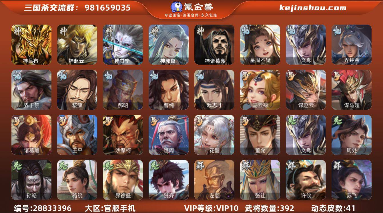 【709】官阶:大将军;VIP等级:VIP10;史诗武将数量:33;动态皮肤数量:41;武将总数:392;史诗宝珠数量:2;将魂数量:5827;神将:7;魏国史诗武将:15;蜀国史诗武将:9;吴国史诗武将:5;群史诗武将:7 神吕布,神赵云,神甘宁,神郭嘉,神吕蒙,神周瑜,神诸葛亮,星周不疑,文鸯,界钟会,界于禁,嵇康,郝昭,曹纯,戏志才,马云騄,谋赵云,谋马超,诸葛瞻,王平,沙摩柯,谯周,花鬘,董允,周处,孙皓,骆统,界徐盛,贺齐,左慈,张让,苏飞,麹义,张绣,李傕,许攸,神郭嘉-虎年清明(动态),神甘宁-万人辟易(动态),钟会-潜蛟觊天(动态),曹丕-气荡山河(动态),甄姬-明珠耀躯(动态),SP蔡文姬-兔年冬日(动态),许褚-兔年端午(动态),曹昂-竭战麟伤(动态),朱灵-以战破氐(动态),曹纯-虎年春节(动态),刘备-龙御天下(动态),诸葛瞻-绵竹之殇(动态),张星彩-猪年中秋(动态),张翼-锐不可当(动态),李丰-太仓聚粟(动态),周处-义除三害(动态),孙权-永开吴祚(动态),孙策-虎踞江东(动态),孙权-牛年七夕(动态),孙尚香-星流霆击(动态),界孙权-牛年七夕(动态),界孙尚香-星流霆击(动态),徐盛-破军杀将(动态),文鸯-势若万钧(动态),袁绍-声震寰宇(动态),麹义-扬刀立威(动态),袁绍-一往无前(动态),界袁绍-一往无前(动态),SP貂蝉-驭魂千机(动态),张鲁-安民护祚(动态)