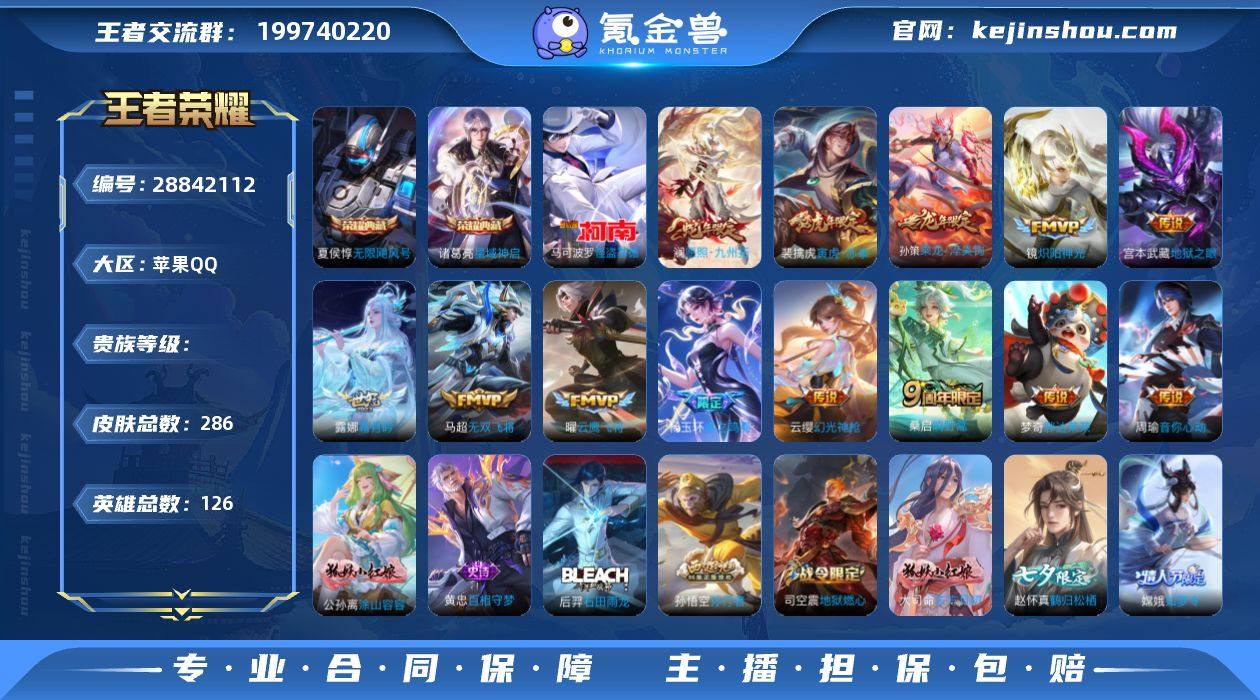 实名: 可修改 英雄数: 126 皮肤数: 286 荣耀水晶: 无限飓风号,星域神启 珍品传说: 怪盗基德 传说皮: 云鹰飞将,炽阳神光,地狱之眼,音你心动-周瑜,胖达荣荣,无双飞将,霜月吟,乘龙·淬吴钩,幻光神枪,星之鸣奏 限定皮: 李小龙,白晶晶,如梦令-嫦娥,孙行者,寅虎·赤拳,时之祈愿-云中君,匿光决锋者,五谷丰年,鸣野蒿,逐霄战戟,愿照·九州拓