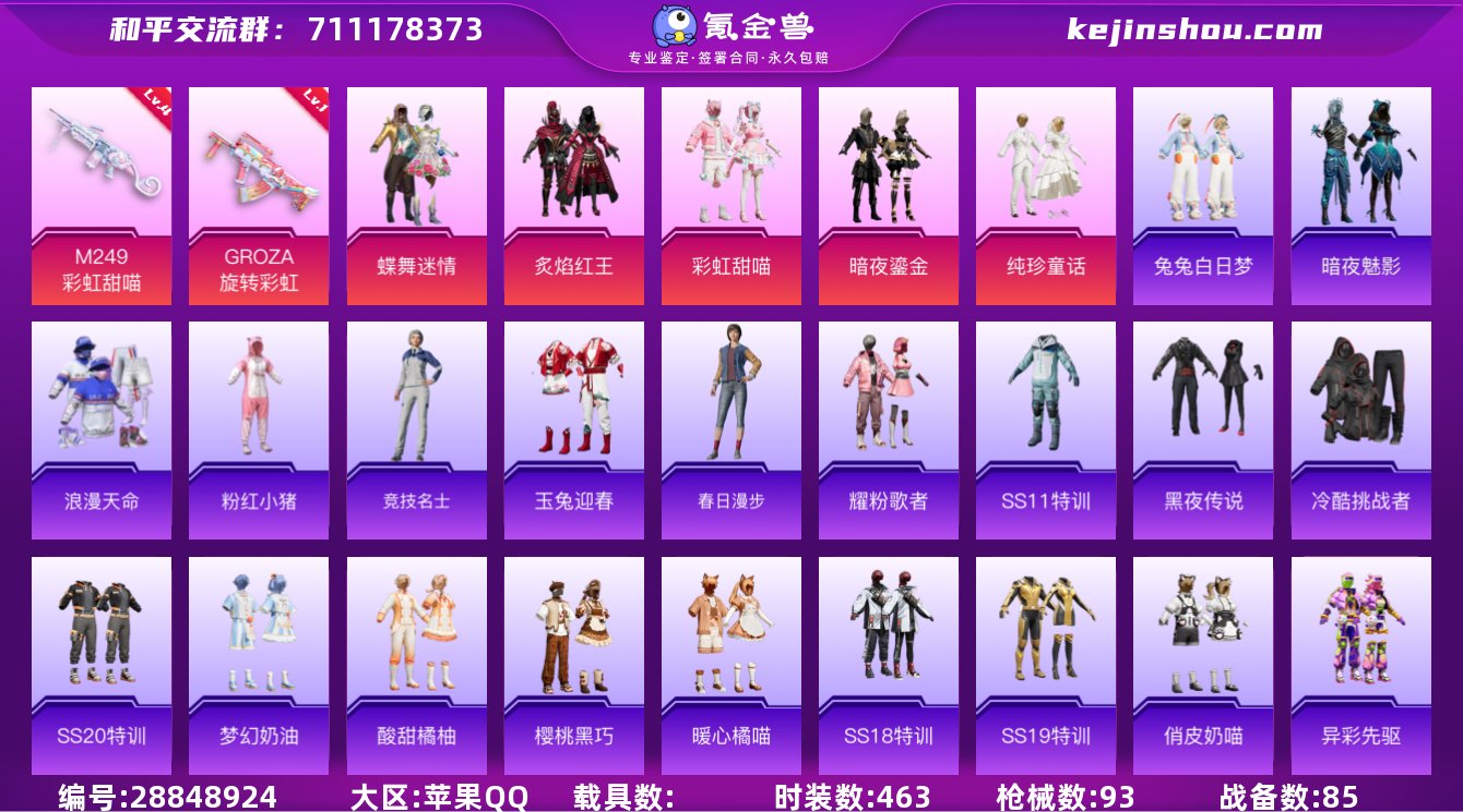 纯真童话!热力值3.2万!可二次!D10461.iOSQQ区.104套装 5粉装暗夜鎏金 纯真童话、彩虹甜喵、赤焰红王、蝶舞迷情 93枪皮 2特效枪1级旋转彩虹、4级彩虹甜喵