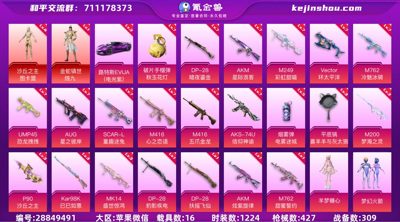 实名:可修改 时装数:1224 载具数:16 枪械数:427 战备数:309 四级沙丘之主-图卡盟,一级金蛇镇世-烛九 三级路特斯EVIJA(电光紫) 羊梦糖心,暗夜鎏金,宝贝奶油派,缤纷油彩,薄荷物语,冰霜白皇,初号机 觉醒Ver.,彩虹鹿灵,彩虹甜喵,炙焰红王,蝶舞迷情,蝶舞蔷薇,复仇流浪者,幻彩马卡龙,寒光使者,金属狂野,焦糖拿铁,极限特训,极致幻想,恐龙拽拽,狂魅哈莉,岚岚物语,洛天依,莲影清波,迷蝶贵族,梦幻火箭,蜜桃特工,千金淑猫,千面幻镜,深海曼妙,天使彩虹糖,甜梦冰蝶,王牌四分卫,雪国幻梦,霞光圣骑,小蓝,向日葵,星之彼岸,音爆索尼克,荧海星豚 冰绡玉鳞,保时捷Taycan旅行版(冰莓粉),阿斯顿·马丁DBS(金),玛莎拉蒂Ghibli(金),宾利欧陆GT敞篷(火焰橘),鬼马风驰,合金龙骨(蓝),晶梦灵驹,灵鼠银迹,路特斯ELETRE(花绽灰),擎天重拳,双人摩托-双刃魅影(绿),特斯拉Roadster(水滴蓝),星梦玉骢,永恒黄蜂 七级AKM-星际浪客,七级AKS-74U-信仰神谕,七级AUG-星之彼岸,七级DP-28-暗夜鎏金,七级M249-彩虹甜喵,七级M416-五爪金龙,七级M416-心之恋语,七级M762-冷魅冰骑,七级破片手榴弹-秋玉花灯,七级SCAR-L-童趣迷兔,七级UMP45-恐龙拽拽,七级Vector-环太平洋,五级烟雾弹-电雾迷城,三级平底锅-喜羊羊与灰太狼,三级Kar98K-巳巳如意,三级M200-梦海之灵,三级MK14-盛世惊鸿,三级P90-沙丘之主,一级DP-28-豹影疾电,一级AKM-炫紫旋律,一级DP-28-扶摇飞仙,一级M762-甜蜜誓约 卖家说:自用一手号,全部为自己充钱积累的,微信单独的,没有任何违规行为