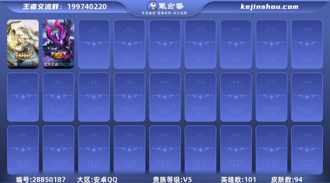 安卓QQ/V5/永恒钻石/94皮肤/101英雄/0典藏/0珍品无双/0无双/0珍品传说/3传说/18史诗/6稀有英雄