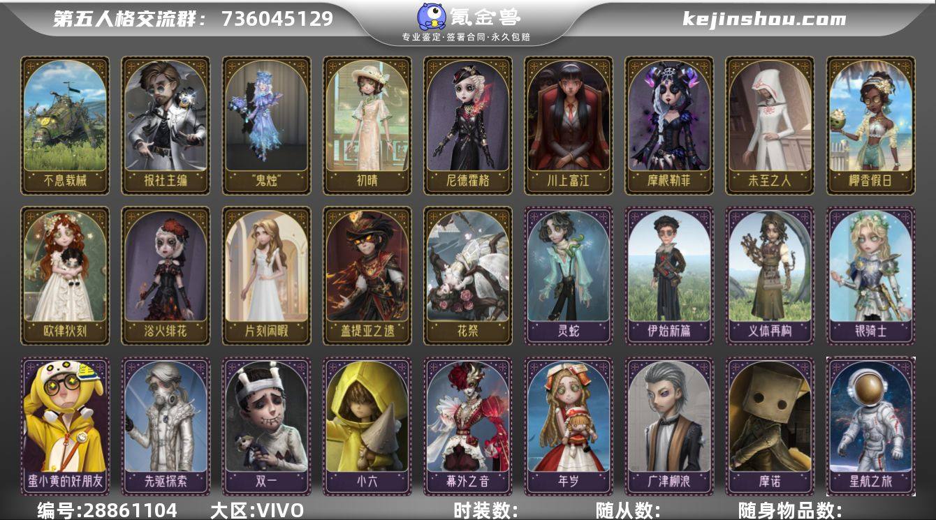 vivo渠道服 14金61紫 冒险家-报社主编,梦之女巫-川上富江,祭司-摩根勒菲,空军-尼德霍格,医生-浴火绯花,蜘蛛-花祭,咒术师-椰香假日,“小女孩”-欧律狄刻,勘探员-盖提亚之遗,园丁- 初晴,昆虫学者-“鬼烛”,蜘蛛-不息载械,爱丽丝·德罗斯-片刻闲暇,爱丽丝·德罗斯-未至之人,魔术师-广津柳浪,幸运儿-双一,“小女孩”-年岁,杂技演员-狡,杂技演员-梶井基次郎,心理学家-莱拉,心理学家-神圣阿斯莫,幸运儿-星航之旅,杂技演员-王马小吉,咒术师-灰烬狂想,作曲家-先驱探索,“小女孩”-小六,歌剧演员-幕外之音,爱哭鬼-摩诺,隐士-游隼,教授-紧急运输,哭泣小丑-灵蛇,幸运儿-蛋小黄的好朋友,“心理学家”-银骑士,木偶师-义体再构,小说家-“伊始新篇”