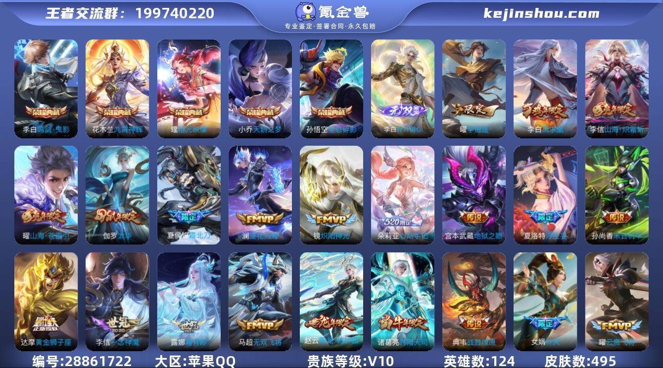 LJ0270 483皮v10小国标曜苹果QQ/至尊星耀/495皮肤/124英雄/5典藏/0珍品无双/1无双/0珍品传说/57传说/169史诗/0稀有英雄 【5 典藏皮肤】鸣剑·曳影 李白,全息碎影 孙悟空,天鹅之梦 小乔,九霄神辉 花木兰,拾光映像 瑶, 【1 无双皮肤】碎月剑心 李白, 【57 传说皮肤】启明星使 虞姬,云霓雀翎 虞姬,无限倾心 虞姬,逐花归海 澜,飞鸢探春 李元芳,无双飞将 马超,李逍遥 曜,零号·赤焰 孙悟空,地狱火 孙悟空,云鹰飞将 曜,齐天大圣 孙悟空,补天 女娲,神器·狴犴令 狄仁杰,觅芳踪 艾琳,游龙清影 西施,凤求凰 李白,诗剑行 李白,燃星之曲 花木兰,灼幽烈阳 东皇太一,浮生妄 夏洛特,遇见胡旋 貂蝉,猫影幻舞 貂蝉,惊梅引 宫本武藏,地狱之眼 宫本武藏,时雨天司 诸葛亮,炽阳神光 镜,遇见神鼓 吕布,霜月吟 露娜,无限倾心 项羽,无尽星芒 后羿,寅虎·瑞焰 鲁班七号,怒海麟威 吕布,时之恋人 刘备,挚爱之约 孙策,黄金狮子座 达摩,久胜战神 干将莫邪,末日机甲 孙尚香,异界灵契 孙尚香,末日机甲 孙策,山海·炽霜斩 李信,一念神魔 李信,战鼓燎原 典韦,山海·琳琅生 小乔,淬星耀世 赵云,百相守梦 张飞,乘龙·铭钟鼎 赵云,太华 伽罗,绛天战甲 铠,超时空战士 狄仁杰,山海·苍雷引 曜,霜北刀 夏侯惇,冥王哈迪斯 铠,冠军飞将 花木兰,黄金白羊座 张良,心动手记 朵莉亚,群星魔术团 云中君,鸣野蒿 桑启, 【169 史诗皮肤】龙鼓争鸣 蒙犽,时之奇旅 安琪拉,电玩小子 鲁班七号,末日机甲 吕布,白昼王子 嬴政,蔬乡物语 鲁班七号,紫霞仙子 露娜,百解令 蒙犽,高山流水 庄周,银河之约 李元芳,雪夜绮愿 周瑜,奇遇舞章 艾琳,唐三藏 金蝉,暗渊魔法 司马懿,匿光决锋者 夏侯惇,暗影游猎 马可波罗,燃音魔法 高渐离,天秀·音浪 高渐离,白鹤梁神女 大乔,苍穹之光 项羽,天秀·启明 杨戬,狮舞东方 鲁班七号,猫狗日记 大乔,德古拉伯爵 刘邦,山海·玄木吟 马可波罗,心灵战警 亚瑟,五...
