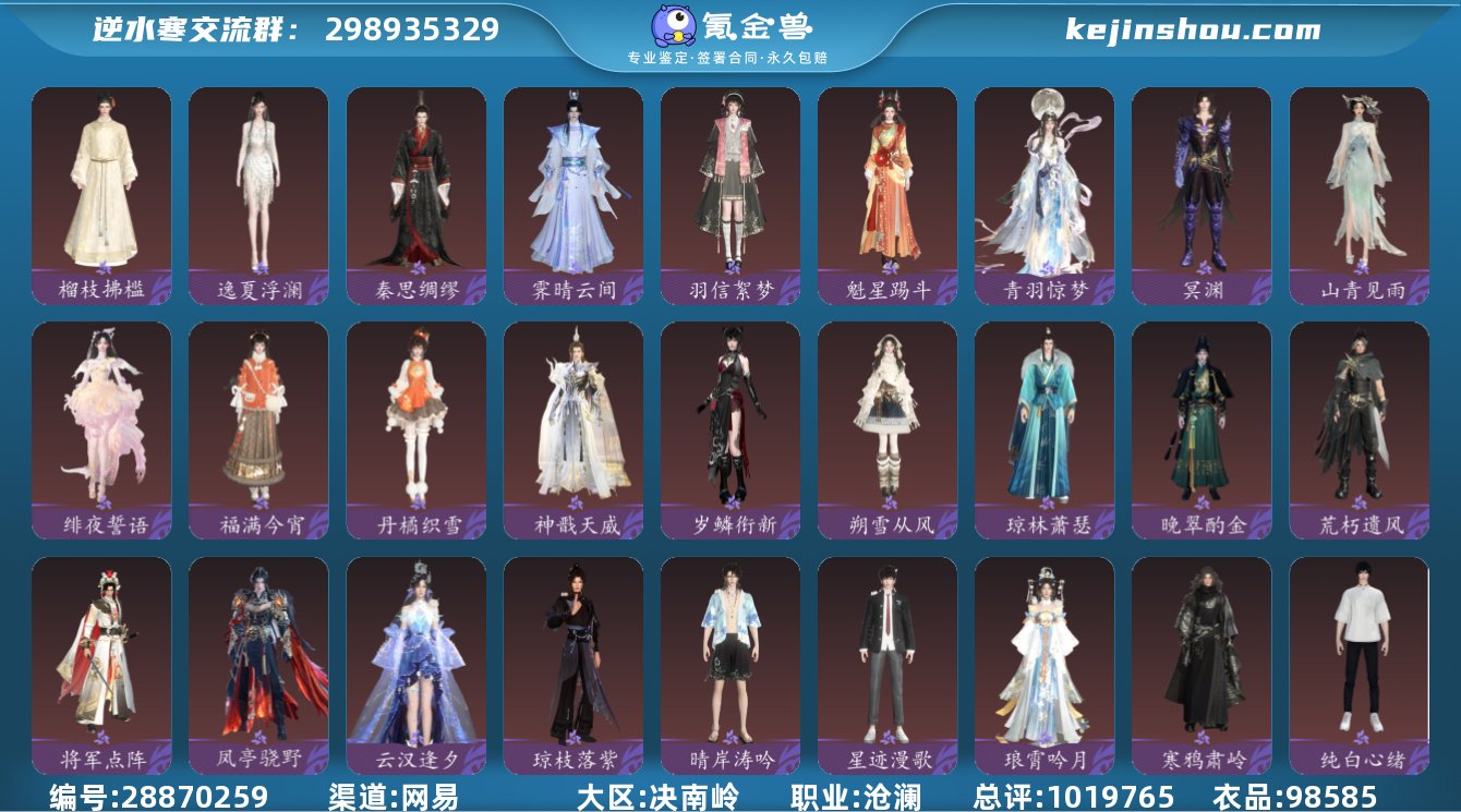 网易支付状态:未注册 换绑冷却:无冷却 职业:沧澜 总评:1019765 衣品:98585 榴枝拂槛,逸夏浮澜,秦思绸缪,霁晴云间,羽信絮梦,魁星踢斗,青羽惊梦,冥渊,山青见雨,绯夜誓语,福满今宵,丹橘织雪,神戬天威,岁鳞衔新,朔雪从风,琼林萧瑟,晚翠酌金,荒朽遗风,将军点阵,凤亭骁野,云汉逢夕,琼枝落紫,晴岸涛吟,星迹漫歌,琅霄吟月,寒鸦肃岭,纯白心绪,凤吟振羽,岁寒玉骨,灵语星彩,侠影流霜,云腾游雾,呱容月貌,丹枫秋意,玄鹰逐日,风动荷衣,南风知暑,蓬海沧歌,贪狼摄星,衣香鬓影,灵兔献瑞,玄喵夜行,霜天寒石,金焰追虎,极夜天曦,舞乐浮烬,鸢染烟纱,金角玄鉴,素尘凌霜,望夜寒星,春梢剪锦 卖家说:2个白发,一个火舞一个祥瑞