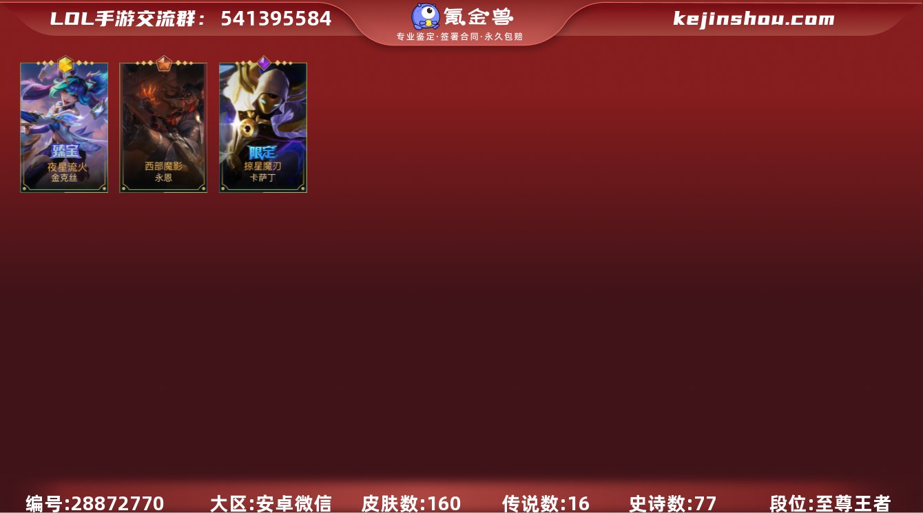实名:可修改 皮肤数:160 典藏皮肤数量:0 神话皮肤数量:3 传说皮肤数量:16 史诗皮肤数量:77 其他皮肤数量:63 夜星流火 金克丝