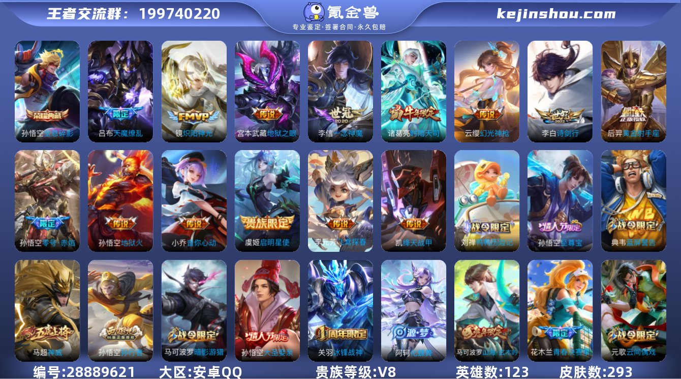 【293皮肤14传说便宜8号,全息碎影孙行者大圣娶亲】:安卓Q-V8-永恒钻石V段位-123英雄-293皮肤-1典藏-0无双-0珍品传说-14传说-88史诗 【荣耀典藏】:孙悟空全息碎影 【内测皮肤】:孙尚香蔷薇恋人,嬴政优雅恋人,狂铁特工战影 【传说皮肤】:吕布天魔缭乱,孙悟空地狱火,宫本武藏地狱之眼,后羿黄金射手座,李信一念神魔,孙悟空零号赤焰,虞姬启明星使,镜炽阳神光,铠绛天战甲,诸葛亮时雨天司,李元芳飞鸢探春,小乔音你心动,李白诗剑行,云缨幻光神枪 【限定皮肤】:狄仁杰阴阳师,赵云皇家上将,墨子神迹守卫,嬴政优雅恋人,嬴政白昼王子,孙尚香蔷薇恋人,鲁班七号狮舞东方,鲁班七号乒乒小将,庄周高山流水,高渐离死亡摇滚,孙膑天狼运算者,吕布天魔缭乱,吕布猎兽之王,周瑜赤莲之焰,元歌云间偶戏,元歌无心,夏侯惇朔风刀,典韦蓝屏警告,马可波罗暗影游猎,马可波罗山海玄木吟,狄仁杰魔术师,狄仁杰万华元夜,达摩星际陆战队,达摩沙漠行僧,项羽海滩派对,老夫子醍醐杖,老夫子航海奇遇记,关羽冰锋战神,程咬金演武夺筹,韩信逐梦之影,韩信飞衡,兰陵王驯魔猎人,兰陵王金庭之子,花木兰青春决赛季,亚瑟潮玩骑士王,孙悟空至尊宝,孙悟空大圣娶亲,孙悟空零号赤焰,孙悟空孙行者,牛魔御旌,后羿圣弓游侠,李元芳银河之约,李元芳匿光侦查者,李元芳云中旅人,虞姬启明星使,钟馗神迹守卫,钟馗驱傩正仪,女娲朔望之晖,干将莫邪真爱魔法,雅典娜单词大作战,雅典娜黎明之约,蔡文姬繁星吟游,太乙真人华丽摇滚,鬼谷子原初探秘者,鬼谷子五谷丰年,诸葛亮时雨天司,苏烈千军破阵,百里玄策原初追逐者,百里守约朱雀志,弈星混沌棋,梦奇顽趣,沈梦溪星空之诺,沈梦溪大漠名商,明世隐疑决卦,裴擒虎李小龙,裴擒虎擒涛扼浪,狂铁御狮,米莱狄御霄,米莱狄胡桃异想国,云中君纤云弄巧,伽罗...