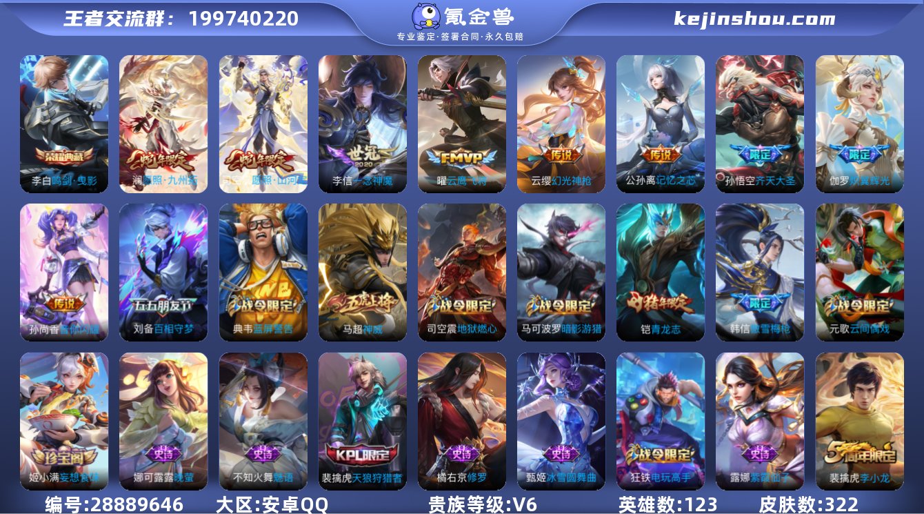 【李白鸣剑曳影】:安卓Q-V6-永恒钻石III段位-123英雄-322皮肤-1典藏-0无双-0珍品传说-9传说-95史诗 【荣耀典藏】:李白鸣剑曳影 【内测皮肤】:孙尚香蔷薇恋人,高渐离玩趣恶龙,狂铁特工战影 【传说皮肤】:孙尚香音你闪耀,孙悟空齐天大圣,公孙离记忆之芯,李信一念神魔,伽罗炽翼辉光,曜云鹰飞将,云缨幻光神枪,澜愿照九州拓,司空震愿照山河定 【限定皮肤】:姜子牙天穹之誓,狄仁杰阴阳师,赵云皇家上将,赵云百木心枪,墨子神迹守卫,墨子降魔,孙尚香蔷薇恋人,庄周高山流水,高渐离死亡摇滚,高渐离玩趣恶龙,钟无艳超时空战士,扁鹊奇幻香踪,白起夜都怪侠,芈月重明,芈月幻夜卜梦,元歌云间偶戏,元歌无心,甄姬落雪兰心,典韦蓝屏警告,马可波罗暗影游猎,狄仁杰魔术师,狄仁杰万华元夜,达摩星际陆战队,达摩沙漠行僧,项羽海滩派对,老夫子航海奇遇记,程咬金演武夺筹,韩信傲雪梅枪,王昭君午后时光,兰陵王金庭之子,花木兰瑞麟志,亚瑟潮玩骑士王,孙悟空齐天大圣,牛魔御旌,后羿圣弓游侠,刘备百相守梦,李元芳云中旅人,钟馗驱傩正仪,杨玉环遇见飞天,杨戬潮玩骑兵,干将莫邪真爱魔法,雅典娜单词大作战,鬼谷子原初探秘者,鬼谷子五谷丰年,黄忠火炮绅士,铠青龙志,苏烈千军破阵,梦奇顽趣,沈梦溪大漠名商,明世隐疑决卦,明世隐吟游魔法,裴擒虎天狼狩猎者,裴擒虎李小龙,裴擒虎擒涛扼浪,狂铁御狮,狂铁电玩高手,米莱狄御霄,米莱狄胡桃异想国,云中君纤云弄巧,伽罗炽翼辉光,盾山御銮,猪八戒西部大镖客,上官婉儿梁祝,嫦娥拒霜思,嫦娥暖冬兔眠,西施玲珑珍味,蒙犽狂想玩偶喵,鲁班大师探海日志,桑启海盐诗旅,暃星界游侠,戈娅驭风魔法,艾琳流音漫舞,司空震地狱燃心,阿古朵江河有灵,张良古海寻踪,蒙犽百解令,蒙恬荣光圣徽,高渐离燃音魔法,妲己灵卜魔法,鬼谷子天...