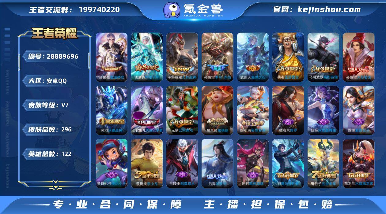 【低价 多皮小号296皮肤-2典藏-4传说 2星元】:安卓Q-V7-永恒钻石V段位-122英雄-296皮肤-2典藏-0无双-0珍品传说-4传说-83史诗 【荣耀典藏】:武则天英雄,诸葛亮星域神启 【内测皮肤】:孙尚香蔷薇恋人,嬴政优雅恋人,艾琳女武神,狂铁特工战影 【传说皮肤】:武则天海洋之心,孙悟空零号赤焰,干将莫邪久胜战神,诸葛亮时雨天司 【限定皮肤】:白起狰,姜子牙天穹之誓,狄仁杰阴阳师,虞姬凯尔特女王,赵云皇家上将,墨子神迹守卫,嬴政优雅恋人,嬴政白昼王子,孙尚香蔷薇恋人,鲁班七号狮舞东方,庄周蜃楼王,庄周高山流水,高渐离死亡摇滚,阿轲迷踪丽影,孙膑妖精王,扁鹊炼金王,白起夜都怪侠,芈月重明,芈月幻夜卜梦,吕布猎兽之王,周瑜赤莲之焰,元歌云间偶戏,夏侯惇朔风刀,甄姬游园惊梦,曹操烛龙,典韦穷奇,典韦蓝屏警告,马可波罗逐梦之星,马可波罗暗影游猎,狄仁杰魔术师,狄仁杰万华元夜,达摩星际陆战队,达摩沙漠行僧,项羽海滩派对,老夫子醍醐杖,老夫子航海奇遇记,关羽冰锋战神,程咬金演武夺筹,刘邦夺宝奇兵,兰陵王驯魔猎人,兰陵王金庭之子,亚瑟狮心王,亚瑟潮玩骑士王,孙悟空大圣娶亲,孙悟空零号赤焰,牛魔御旌,后羿如梦令,后羿圣弓游侠,李元芳银河之约,李元芳云中旅人,钟馗神迹守卫,钟馗驱傩正仪,杨玉环遇见飞天,女娲朔望之晖,干将莫邪真爱魔法,雅典娜单词大作战,雅典娜黎明之约,蔡文姬繁星吟游,太乙真人饕餮,太乙真人华丽摇滚,鬼谷子原初探秘者,鬼谷子五谷丰年,诸葛亮时雨天司,黄忠火炮绅士,苏烈千军破阵,百里玄策原初追逐者,弈星混沌棋,梦奇顽趣,沈梦溪星空之诺,沈梦溪大漠名商,明世隐疑决卦,明世隐吟游魔法,裴擒虎李小龙,裴擒虎擒涛扼浪,狂铁御狮,米莱狄御霄,米莱狄胡桃异想国,云中君纤云弄巧,盾山御銮,猪八戒西部大镖客,猪八戒猪悟能...