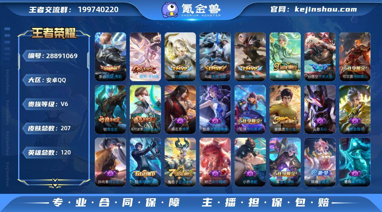 【鸣剑、齐天大圣 无双飞将 玄木吟 精品小号】:安卓Q-V6-120英雄-207皮肤-1典藏-0无双-0珍品传说-6传说-50史诗 【荣耀典藏】:李白鸣剑曳影 【内测皮肤】:嬴政优雅恋人,高渐离玩趣恶龙,狂铁特工战影 【传说皮肤】:孙悟空齐天大圣,马超无双飞将,曜云鹰飞将,镜炽阳神光,桑启鸣野蒿,虞姬愿照岁时盈 【限定皮肤】:姜子牙天穹之誓,狄仁杰阴阳师,赵云皇家上将,嬴政优雅恋人,庄周高山流水,高渐离玩趣恶龙,钟无艳超时空战士,元歌无心,甄姬落雪兰心,马可波罗山海玄木吟,狄仁杰魔术师,达摩沙漠行僧,项羽海滩派对,老夫子醍醐杖,程咬金演武夺筹,王昭君午后时光,兰陵王金庭之子,孙悟空齐天大圣,后羿圣弓游侠,李元芳云中旅人,杨玉环遇见飞天,干将莫邪真爱魔法,鬼谷子原初探秘者,鬼谷子五谷丰年,铠青龙志,苏烈千军破阵,沈梦溪大漠名商,裴擒虎李小龙,裴擒虎擒涛扼浪,狂铁电玩高手,云中君纤云弄巧,嫦娥拒霜思,嫦娥暖冬兔眠,鲁班大师探海日志,桑启海盐诗旅,暃星界游侠,艾琳流音漫舞,司空震地狱燃心,阿古朵江河有灵,张良古海寻踪,蒙犽百解令,鬼谷子天穹祈灯,刘邦剑破天穹,程咬金群星魔术团,周瑜熔金海岸 【年限皮肤】:铠青龙志,马可波罗山海玄木吟 【赛季限定】:达摩沙漠行僧,老夫子醍醐杖,程咬金演武夺筹,兰陵王金庭之子,张良古海寻踪,李元芳云中旅人,鬼谷子原初探秘者,苏烈千军破阵,沈梦溪大漠名商,裴擒虎擒涛扼浪,鲁班大师探海日志,桑启海盐诗旅,鬼谷子天穹祈灯,刘邦剑破天穹,姜子牙天穹之誓 【战令限定】:钟无艳超时空战士,甄姬落雪兰心,王昭君午后时光,艾琳流音漫舞,后羿圣弓游侠,干将莫邪真爱魔法,狂铁电玩高手,嫦娥暖冬兔眠,司空震地狱燃心,暃星界游侠 【史诗皮肤】:妲己女仆咖啡,廉颇地狱岩魂,小乔缤纷独角兽,小乔青蛇,赵云未来纪元...