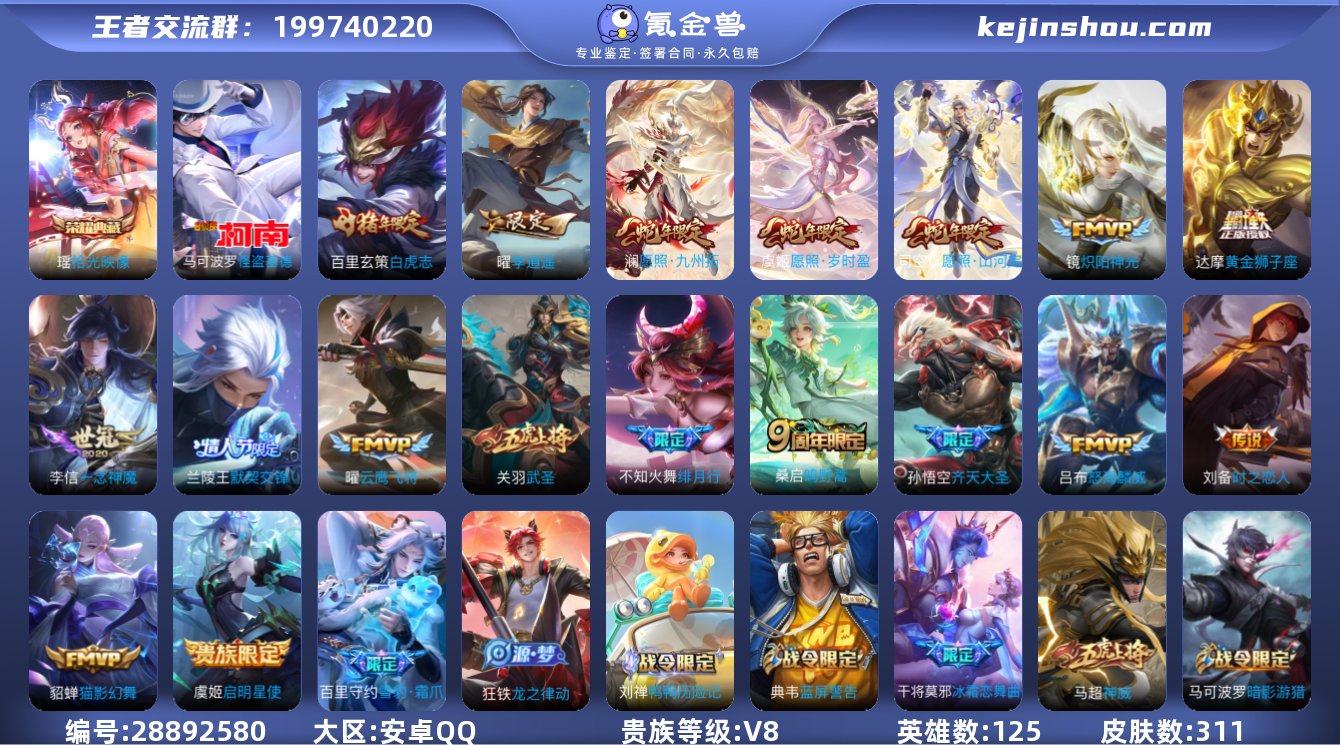 贵族等级:V8 典藏皮肤数:1 珍品无双皮肤数:0 无双皮肤数:0 珍品传说皮肤数:1 传说皮肤数:18 史诗皮肤数:76 皮肤数:311 英雄数:125 段位:星耀 卖家说:急出